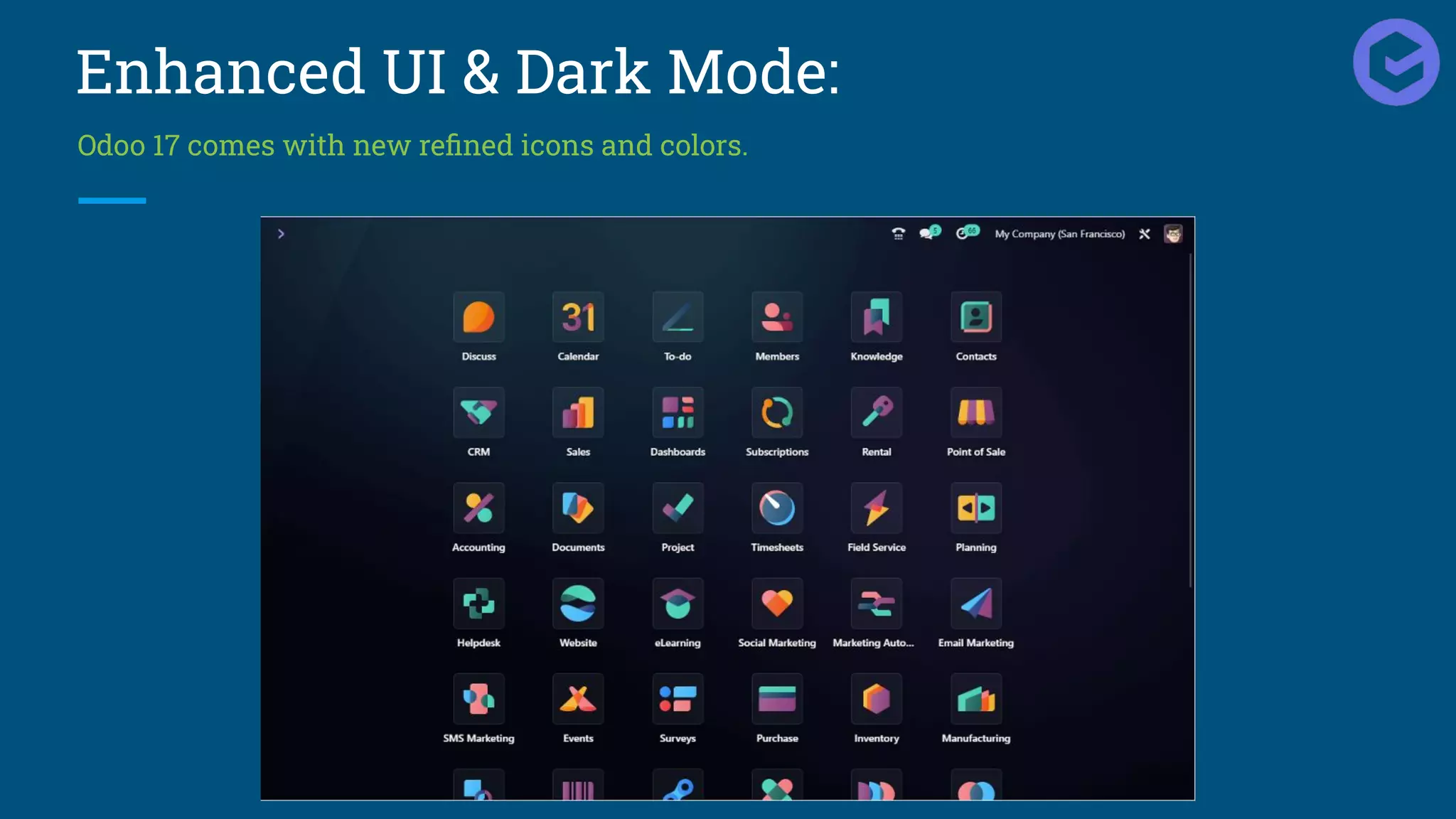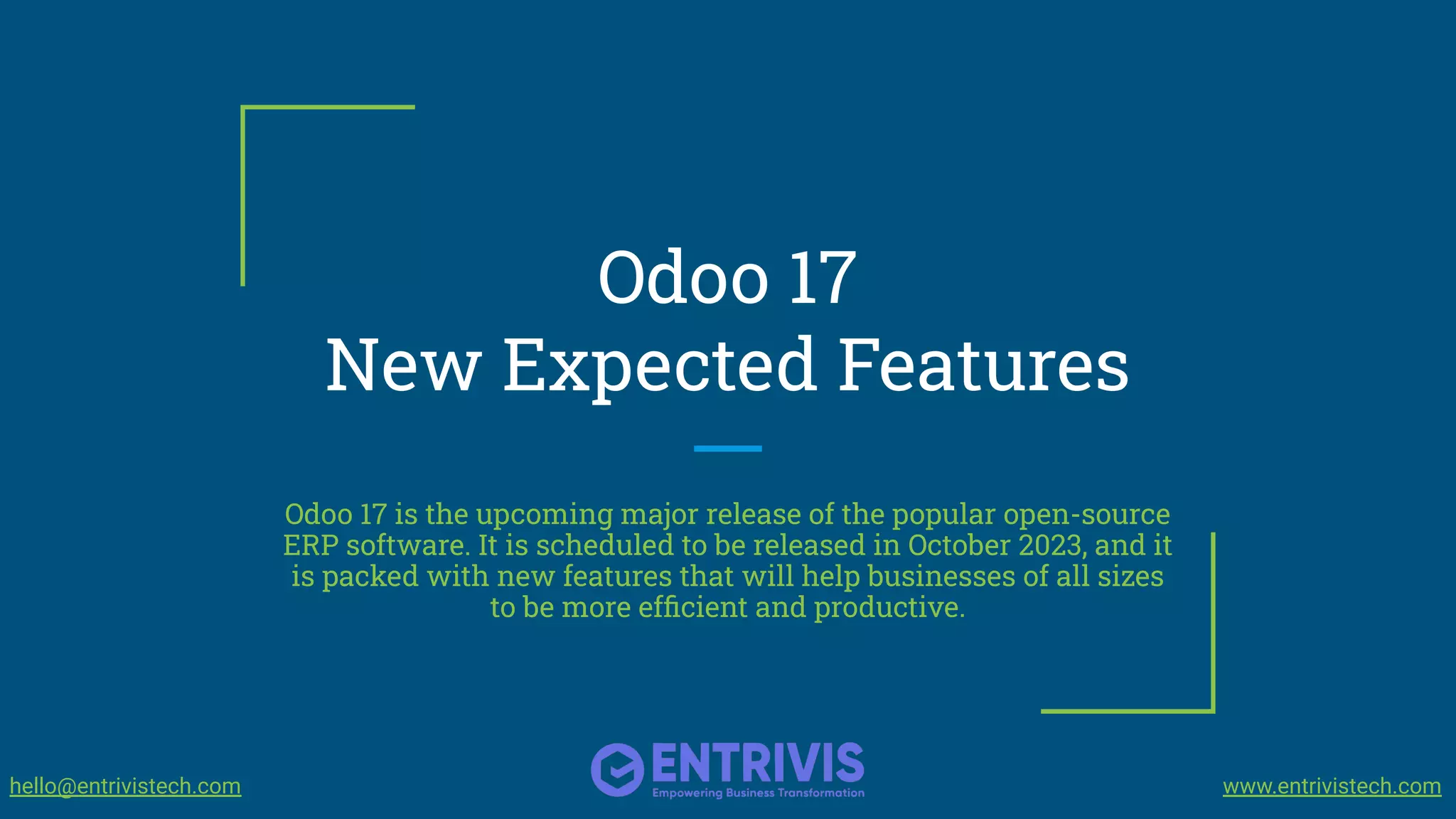 Odoo 17 is set to be released in October 2023, featuring enhancements such as a refined user interface, dark mode, an advanced search view, and a new todo module. Key updates include the ability to add products from a catalog, interactive pop-ups, preparation status in POS, and a self-ordering QR code menu. The release also includes functionality for printing employee resumes and reminders for document signing, aimed at increasing efficiency and productivity for businesses.