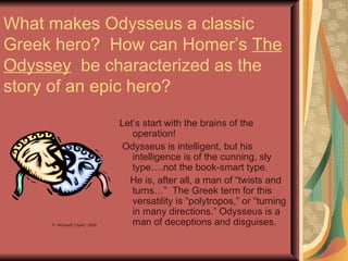 Odysseus is considered a classic Greek hero due to his intelligence and cunning nature. He uses his wit and deception to overcome obstacles on his journey home from the Trojan War, outwitting monsters and enemies. While clever, he also demonstrates physical strength and courage. Odysseus faces many dangers but prefers using his mind to find alternative ways to avoid direct conflict when possible. He possesses both intellectual and physical prowess that enables him to pass various trials on his journey and ultimately reclaim his place as the rightful ruler of his household.