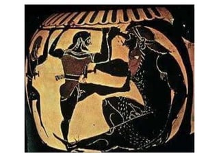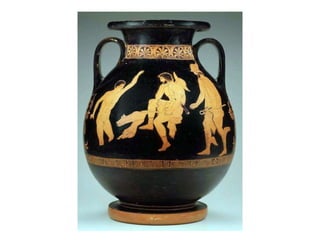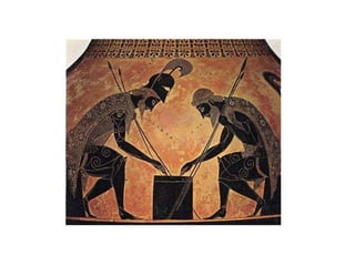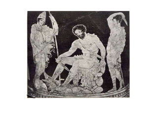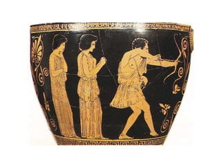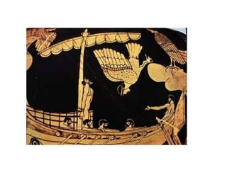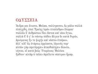 The Odyssey by Homer tells the story of Odysseus' long journey home after the Trojan War. After 10 years away, suitors have overrun his palace, courting his wife Penelope and wasting his resources. With the help of the goddess Athena, Odysseus' son Telemakhos seeks news of his father. Meanwhile, Odysseus escapes from the island of the goddess Kalypso and encounters many dangers at sea. After telling the Phaiakians his story, he returns home in disguise and helps his son kill the suitors and reclaim their household.