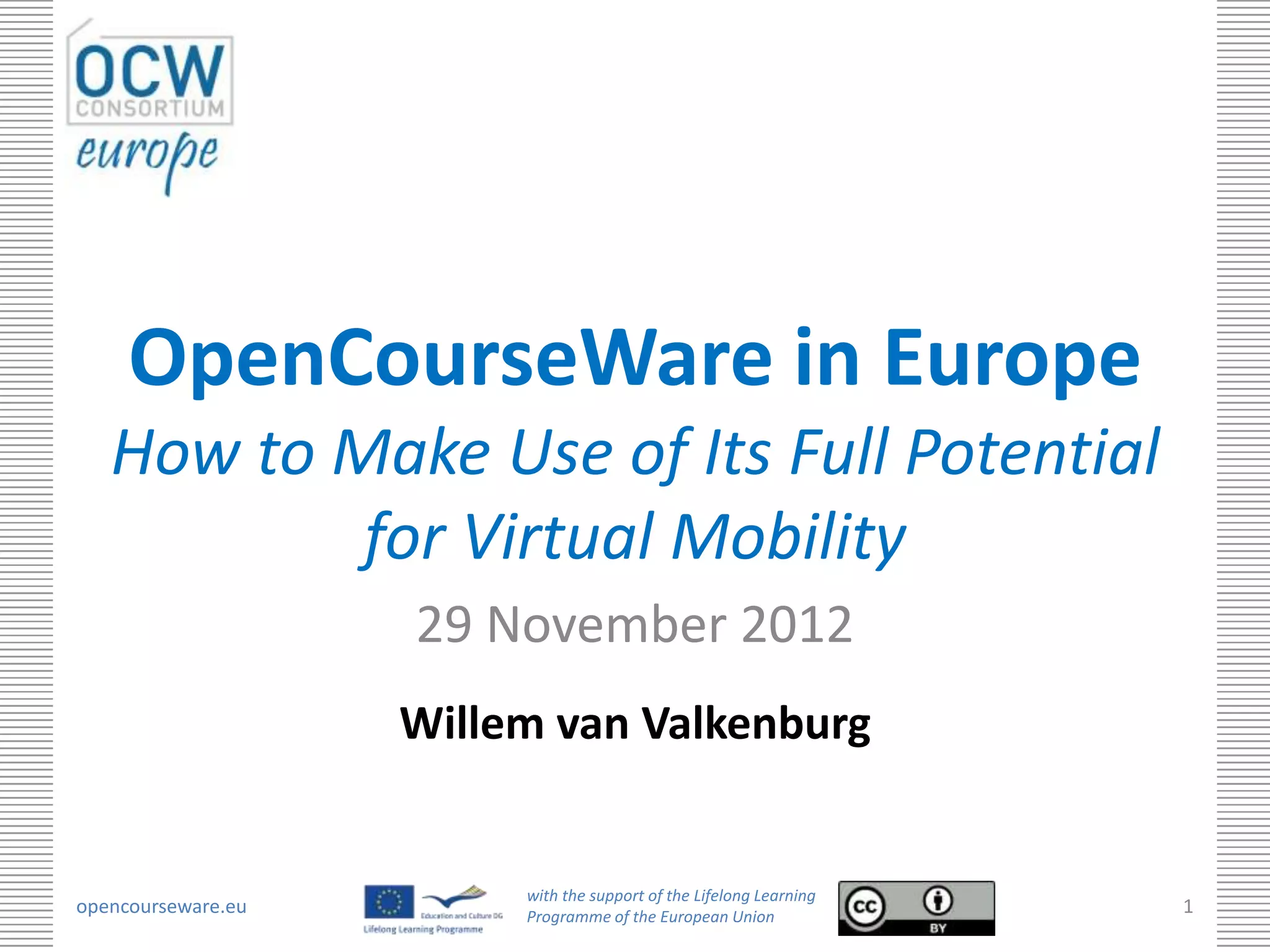 The document discusses the potential of OpenCourseWare (OCW) in Europe for enhancing virtual mobility in higher education, pointing out the need for stronger cooperation between institutions and the challenges posed by existing copyright laws. It outlines objectives for creating a robust European OCW framework and highlights research results that inform best practices in OCW implementation. Future plans include creating guidelines for student mobility and promoting open educational resources across various initiatives.