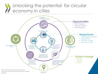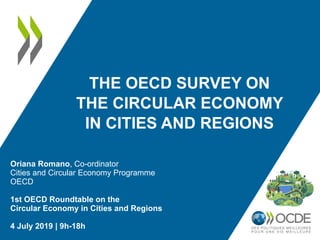 The document summarizes key points from an OECD survey on circular economies in cities and regions. It finds that while most cities and regions have emerging or in-progress circular economy initiatives, fully adopting circular economies requires a holistic and systemic approach across all sectors of cities. Common tools used by cities include pilots and experimentations, capacity building, sustainable public procurement, and dedicated budgets. Top priorities for cities include overcoming obstacles to transitioning and further developing circular economy plans and policies over the long term through the OECD's circular economy program.