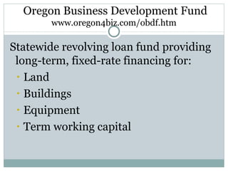 The Oregon Economic and Community Development Department aims to enhance Oregon's economy by working with various stakeholders to support sustainable growth and job creation. The document outlines various funding programs available for businesses, including long-term loans, credit enhancement funds, and resources for entrepreneurs, as well as comprehensive support services for government contracting and business retention. Additionally, it provides information on the USDA loan programs and rural development initiatives focused on supporting agriculture and rural communities.