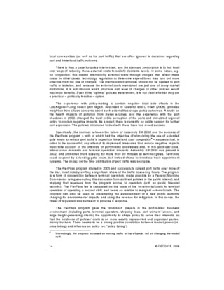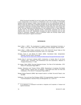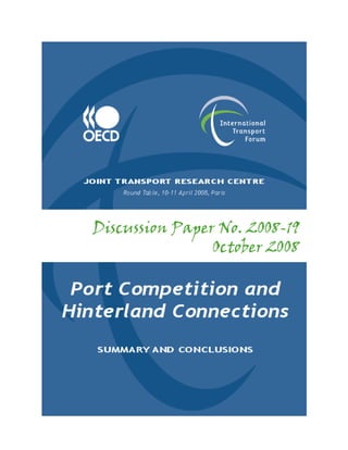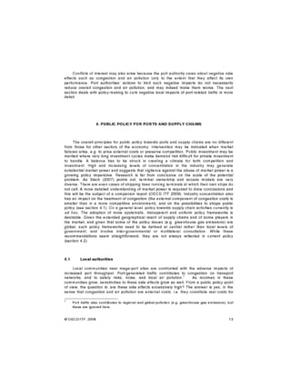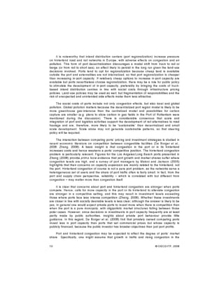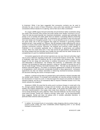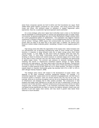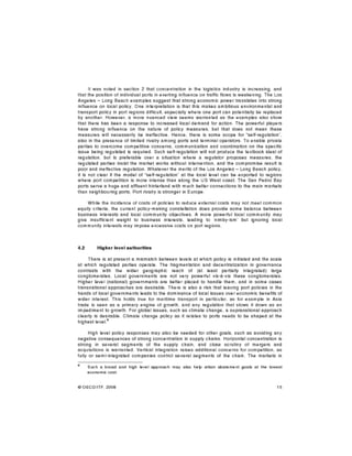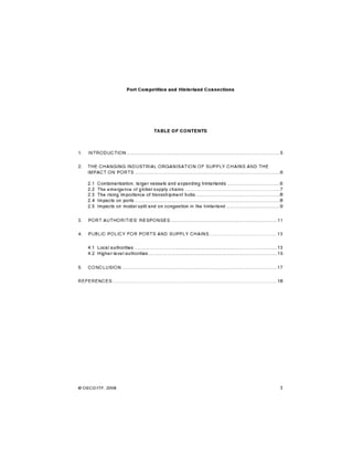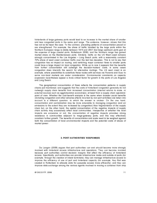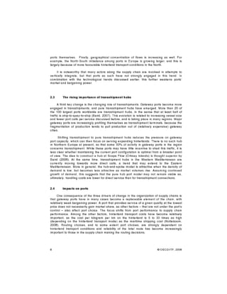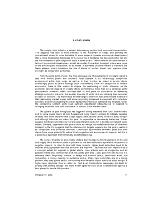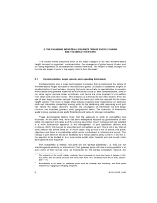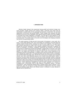 This document discusses changes in maritime freight transport and their impacts on ports. It notes that containerization, larger vessels, and expanded hinterlands have increased competition between ports by making them closer substitutes. Global supply chains and the rise of transshipment hubs have further reduced ports' power over shippers and shipping companies. While these changes have driven efficiency, they have also concentrated market power among fewer players. This raises issues around competition, pollution, congestion, and infrastructure that require policy attention at national or international levels.