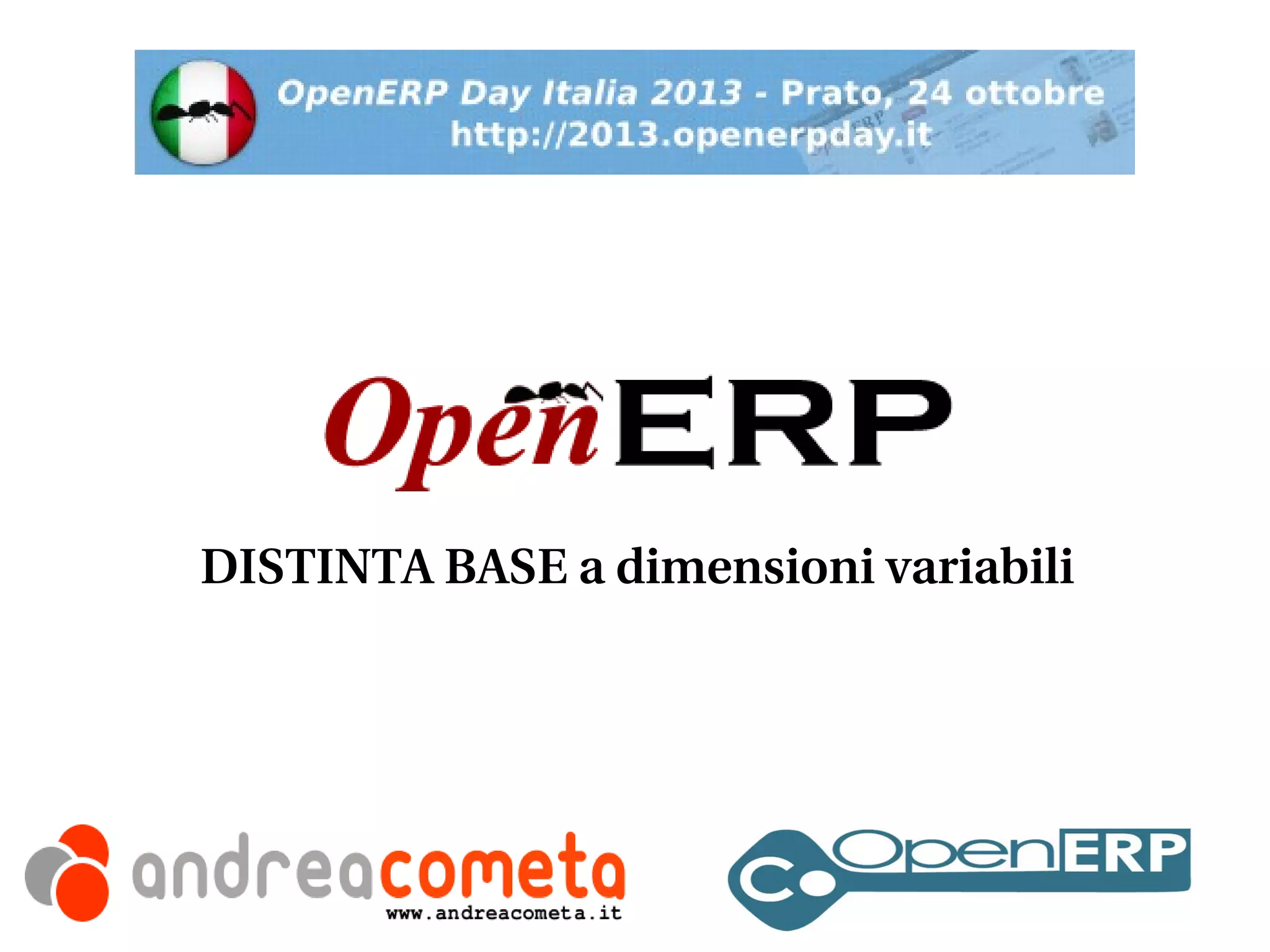Il documento discute la gestione delle distinte base in un'azienda di produzione di zanzariere, evidenziando le sfide nell'implementazione delle varianti di prodotto e nel calcolo delle componenti. Propone soluzioni attraverso l'uso di OpenERP, sottolineando la flessibilità e l'open source come vantaggi. Infine, descrive il processo di vendita al magazzino e il monitoraggio dello stato di avanzamento della produzione.