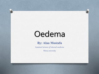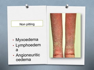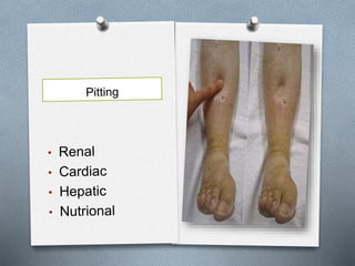 This document discusses different types of jaundice and edema. It defines jaundice as yellowish discoloration of the skin, sclera, or both. It then presents three clinical cases and asks the reader to identify the type of jaundice in each case. The types listed are hemolytic, hepatocellular, or obstructive jaundice. It also defines edema as abnormal accumulation of fluid in interstitial tissue due to disturbed fluid regulation. The types of edema listed are pitting and non-pitting edema. Factors that can cause edema include renal disease, liver disease, heart failure, and nutritional deficiencies.