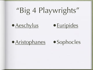 The document provides information about Greek drama, including the four major playwrights - Aeschylus, Euripides, Aristophanes, and Sophocles. It focuses on Sophocles, describing his life and influence. Additionally, it discusses Greek theaters, major themes in tragedies, and defines terms like the tragic hero. The document aims to give context and background for understanding Greek drama and tragedies like Oedipus Rex.