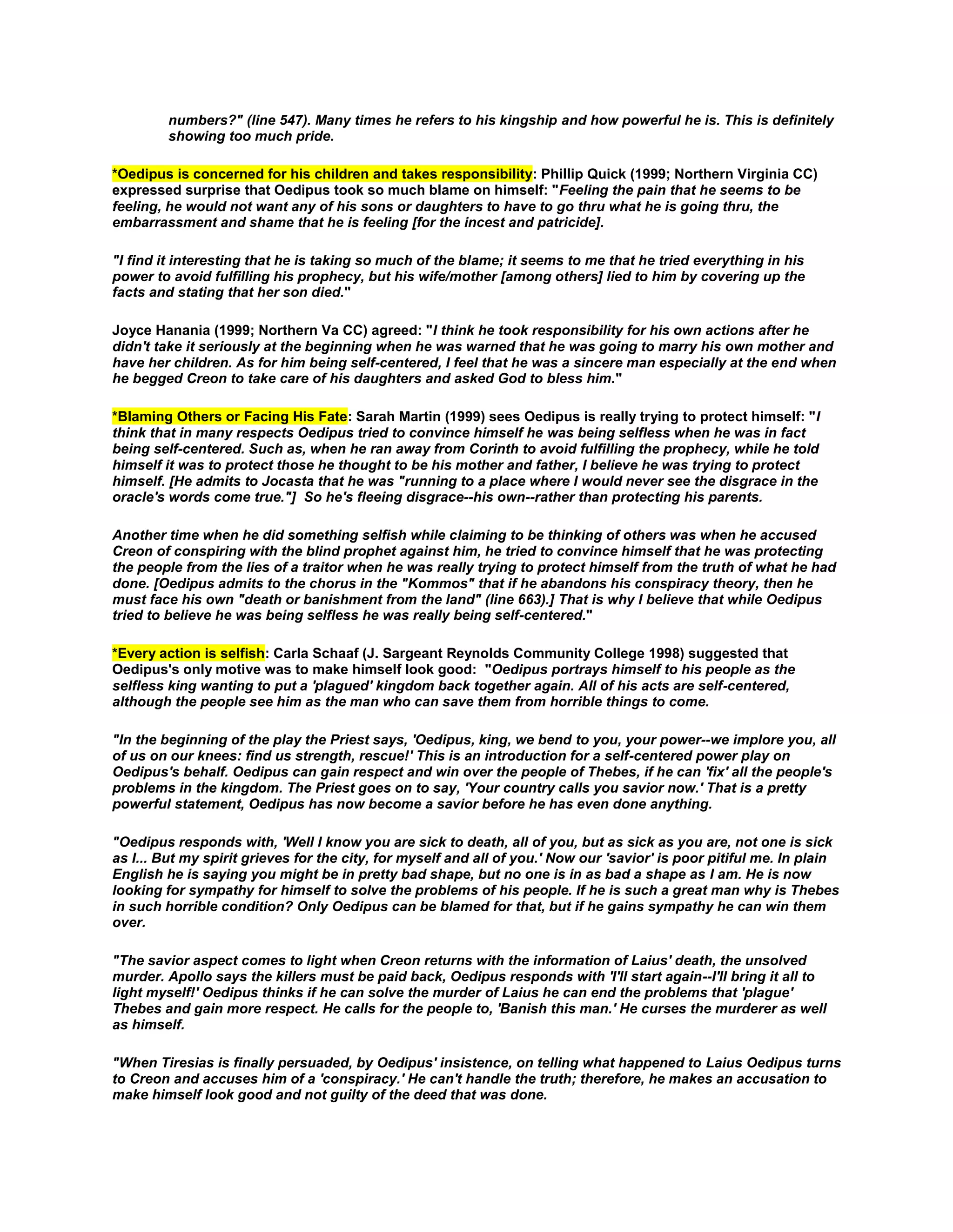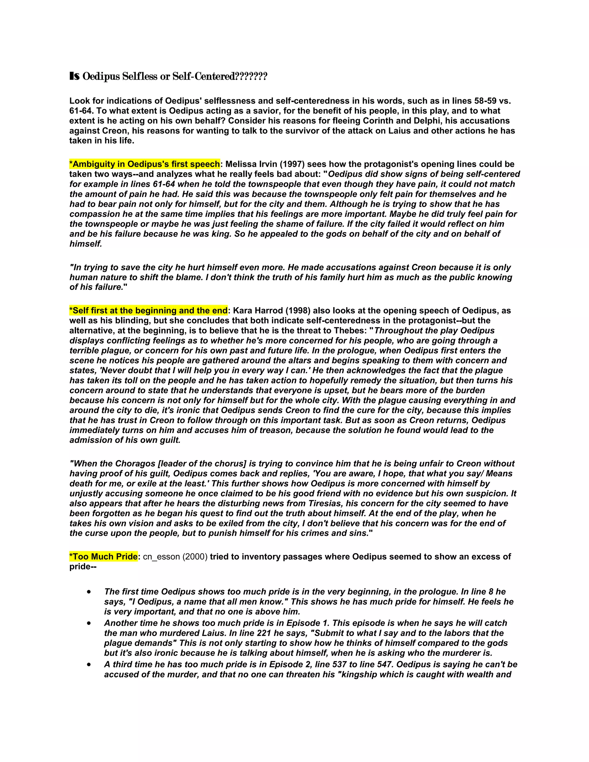 Oedipus exhibits both selfless and self-centered traits according to different interpretations. Some see him as primarily acting to save his people from plague, while others argue that his main motivation is to protect his own reputation and position as king. His decision to flee Corinth and later accusations against Creon are debated as either self-preserving or for the good of Thebes. Scholars disagree on whether Oedipus' fatal flaws were pride, persistence, or an inability to consider how his actions related to the prophecy about his destiny.
