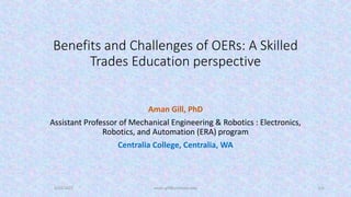 The document discusses the benefits and challenges of using open educational resources (OERs) for skilled trades education programs. Some key benefits include lowering costs for students compared to expensive textbooks, allowing for more flexibility to combine various resources to cover latest topics, and providing digital access to resources even after graduation. However, some challenges are that much of the relevant multimedia content is not openly licensed, third-party equipment videos and code forums cannot always be attributed as OERs, and OERs do not always undergo the same rigorous review process as textbooks.