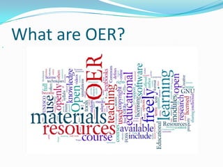 The document discusses Open Educational Resources (OER), defined as teaching, learning, and research materials that are publicly accessible or released under licenses that allow free use and redistribution. It highlights the importance of openness in education, emphasizing that shared materials can be adapted and improved for diverse audiences, while also addressing copyright considerations and the potential challenges of sharing OER. Various types of OER, including textbooks, videos, and course materials, are mentioned, alongside resources for learning more about OER and how to use open licenses.