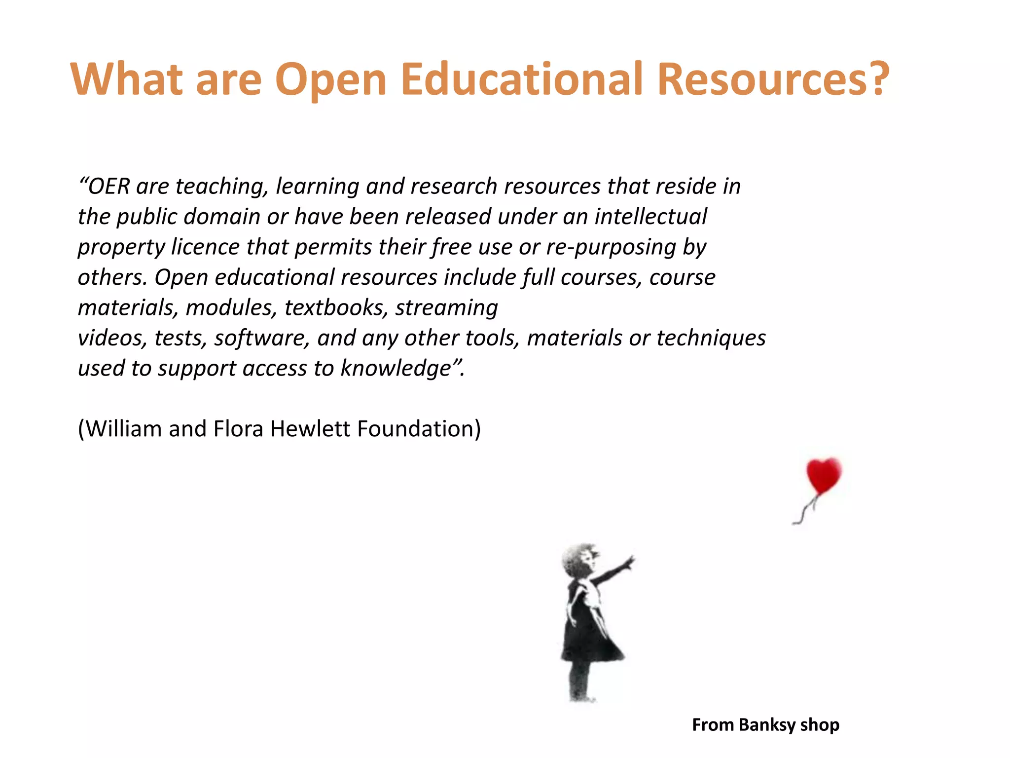 The document discusses open educational resources (OER), which are teaching and learning materials that are freely available online. It defines OER and provides 10 key points about them, including that they are free to use and can be altered. The document discusses OER repositories, tools for developing OER, intellectual property issues, and findings from a project on embedding OER in research methods teaching through collaboration.