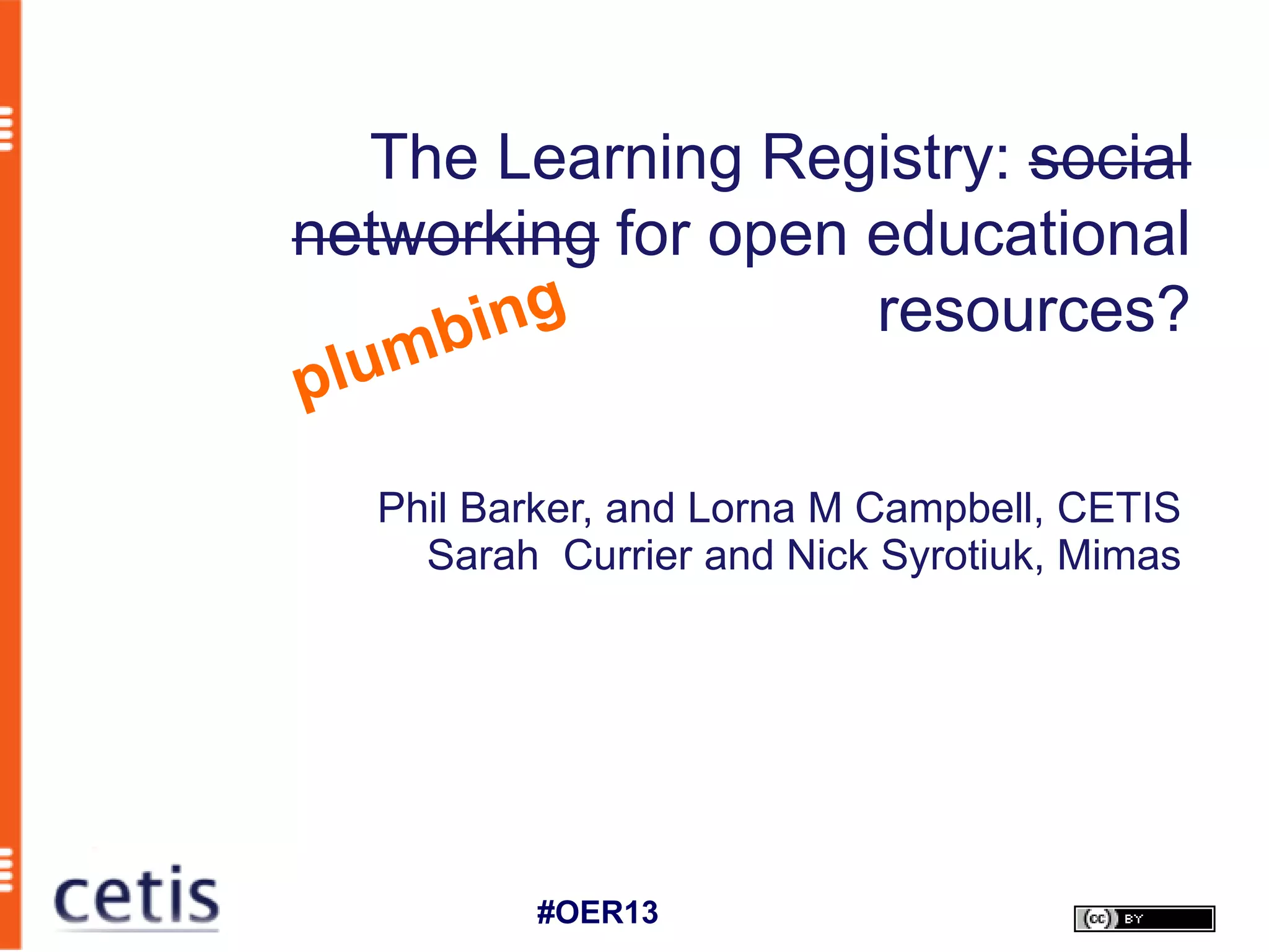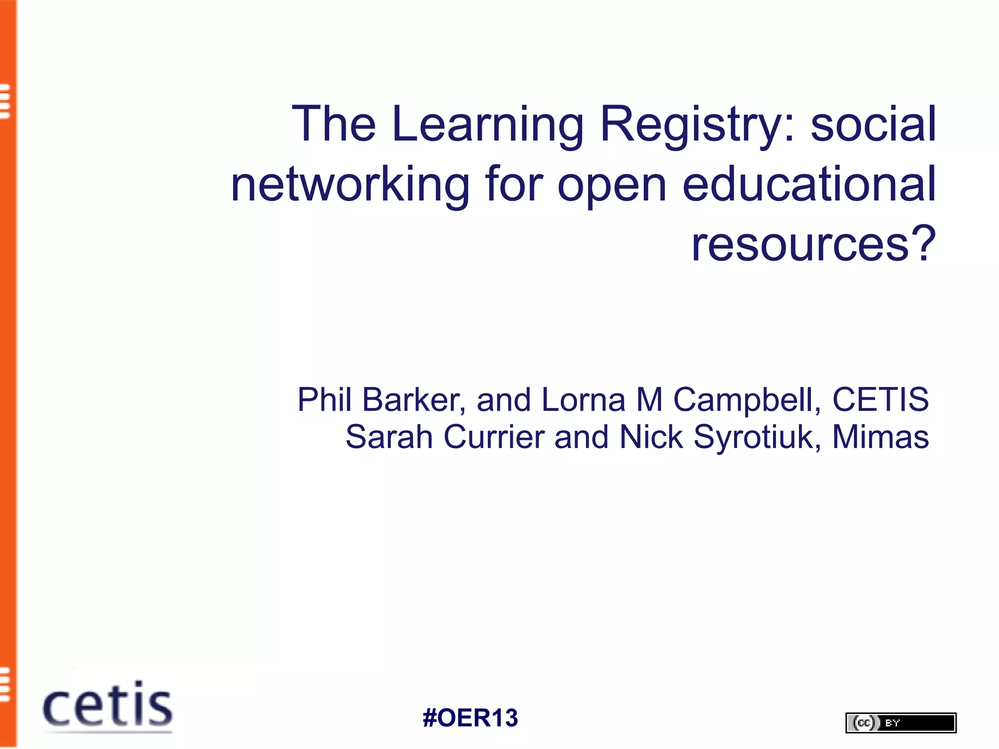 The document discusses the Learning Registry, a distributed infrastructure initiated in 2010 for sharing metadata and usage data about Open Educational Resources (OER). It highlights the challenges of exchanging educational resource data due to diverse metadata schemas and emphasizes the importance of capturing contextual data through user interactions. While the Learning Registry is a technically innovative solution, its overall impact on the UK further/higher education sector has been minimal, primarily serving as a proof of concept.