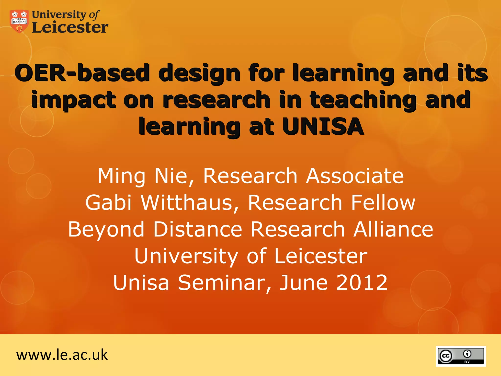 This document summarizes a presentation given by Ming Nie and Gabi Witthaus from the Beyond Distance Research Alliance at the University of Leicester to the University of South Africa (UNISA) in June 2012. The presentation provided an overview of open educational resource (OER) development in the UK and OER work being done at the University of Leicester, including various OER projects, repositories, and initiatives to support OER creation and use. It also included a discussion of how UNISA could apply lessons from the University of Leicester's OER work.