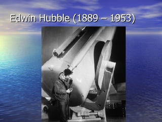 SlipherHubble, Humason (Mt Wilson sterrenwacht) Slipher kon van ca. 40 ver gelegen spiraalnevels de verwijderingsnelheid meten; methode: bepaal de verplaatsing van de spectraallijnen Hubble en Humason bevestigden Slipher’s vondst: sterk rood verschoven spectra; de meesten blijken zich van ons te verwijderen ! Daarna bepaalde Hubble de afstanden van die stelsels: de expansie van het heelal ontdekt! Deze ontdekking stamt uit 1929, maar de metingen van de verwijderingsnelheid waren al eerder bekend