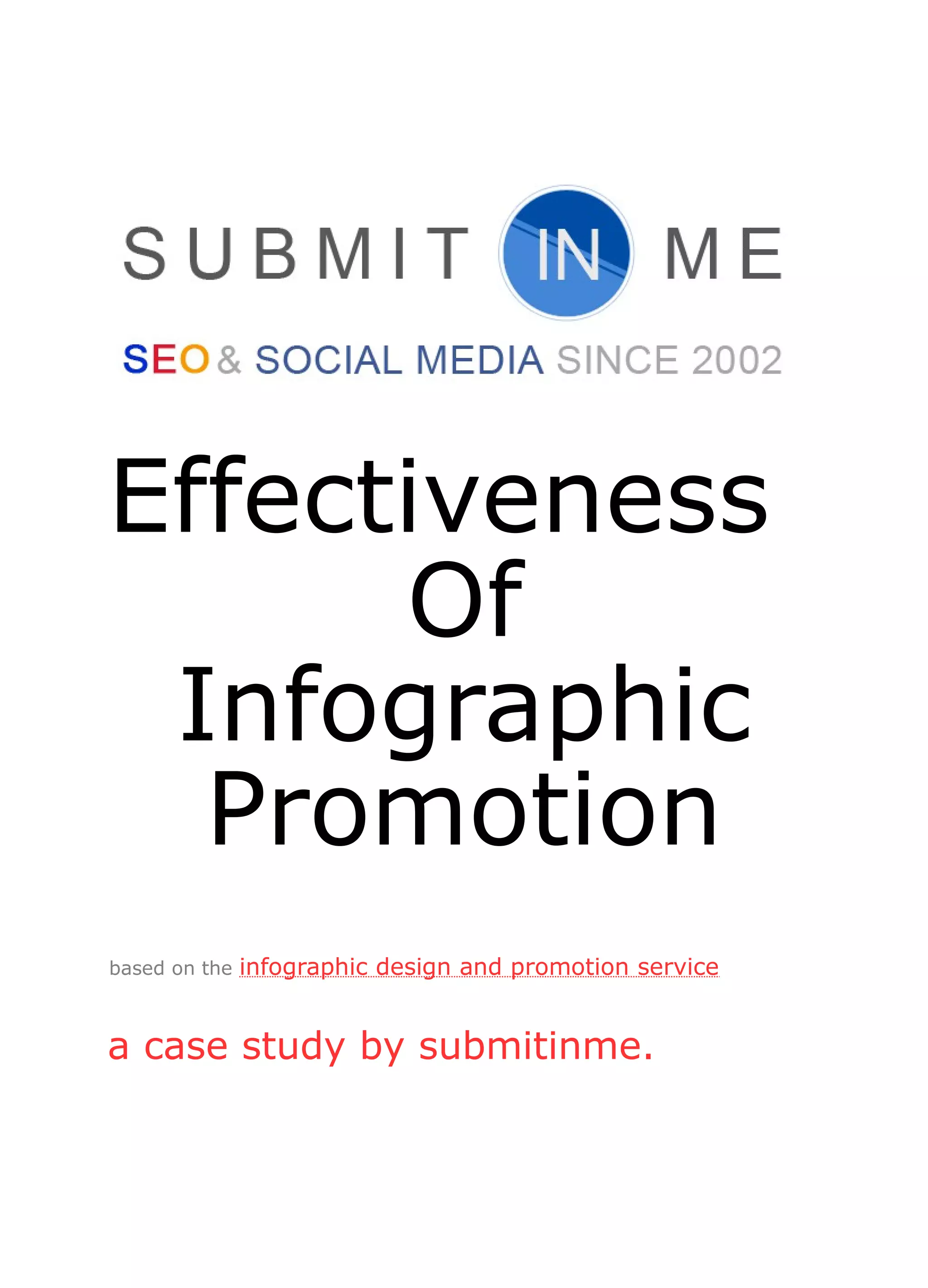 The document presents a detailed case study on the effectiveness of infographic and quotographic promotion strategies for branding, traffic generation, and SEO. It highlights the positive impact of these promotional methods, especially through social media sharing, and discusses their varying levels of effectiveness based on the content's nature and complexity. The conclusion advocates both infographics and quotographics as viable marketing strategies, with suggestions on their optimal use for different branding objectives.