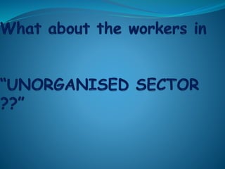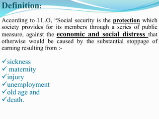 The document discusses social security in India. It defines social security according to the ILO and outlines its key purposes. Social security in India includes preventive, promotional, and protective schemes. Major protective schemes discussed are Employees' State Insurance (ESI), Employees' Provident Fund (EPF), Workmen's Compensation, Payment of Gratuity, and Maternity Benefit. ESI provides healthcare and income support in cases like sickness, injury, unemployment, etc. EPF provides retirement benefits. The document also briefly outlines other schemes like CGHS and those under the National Social Assistance Programme.