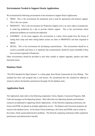 This document proposes a flexible architecture for Oracle applications, focusing on efficient deployment and maintenance of various application instances within a network computing environment. It outlines standards for managing environments necessary for Oracle applications, addressing issues such as patching and upgrades, while emphasizing the importance of customization for enterprises. The authors, Bill Milligan and Mahesh Vallampati, share insights from their experience upgrading Oracle systems, highlighting best practices for implementation and maintenance.
