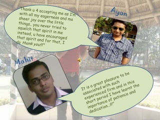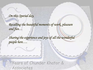 This document celebrates the 20th anniversary of Chunder Khator & Associates, reflecting on the company's history, culture, and people. It highlights the leadership of founder Rishi Khator, called "Mr. Perfectionist", and tours the office spaces where employees develop ideas and do their work. Current and former employees share their positive experiences at CKA and gratitude toward Rishi for guidance and opportunities to learn and develop professionally over the years. The document concludes by wishing continued success and thanking Rishi for his support and patience in teaching employees in different ways.