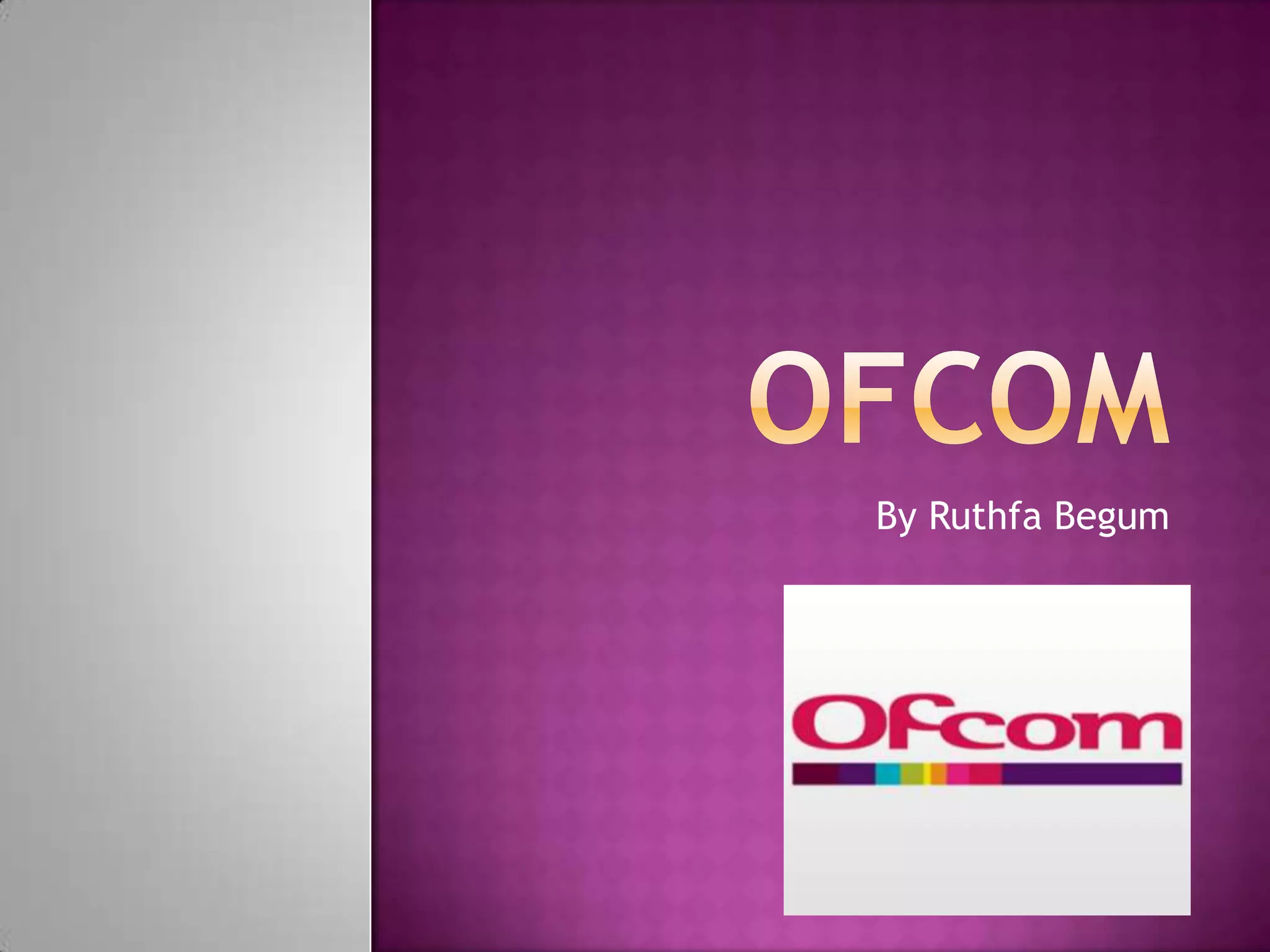 OFCOM is the regulatory authority for broadcasting, telecommunications, and postal industries in the UK. It regulates television and radio services from the BBC aimed at UK audiences, as well as telephone, broadband, and postal services. OFCOM's responsibilities include protecting under-18s, avoiding harm, offense, and disorder, and ensuring fairness, privacy, and responsible religious content in broadcasting.