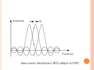 OFDM is a digital multi-carrier modulation technique that divides the available spectrum into several narrowband channels or subcarriers. It allows for high data rates by transmitting multiple digital signals over different subcarriers that are spaced closely together. The data is divided into several parallel data streams or channels, with each subcarrier modulated with a conventional modulation scheme like QAM at a low symbol rate. OFDM has become popular for applications like wireless networking due to its ability to combat multipath fading and its high spectral efficiency. It implements the orthogonal subcarriers using the inverse fast Fourier transform (IFFT) and fast Fourier transform (FFT) to generate the signal and decode it.