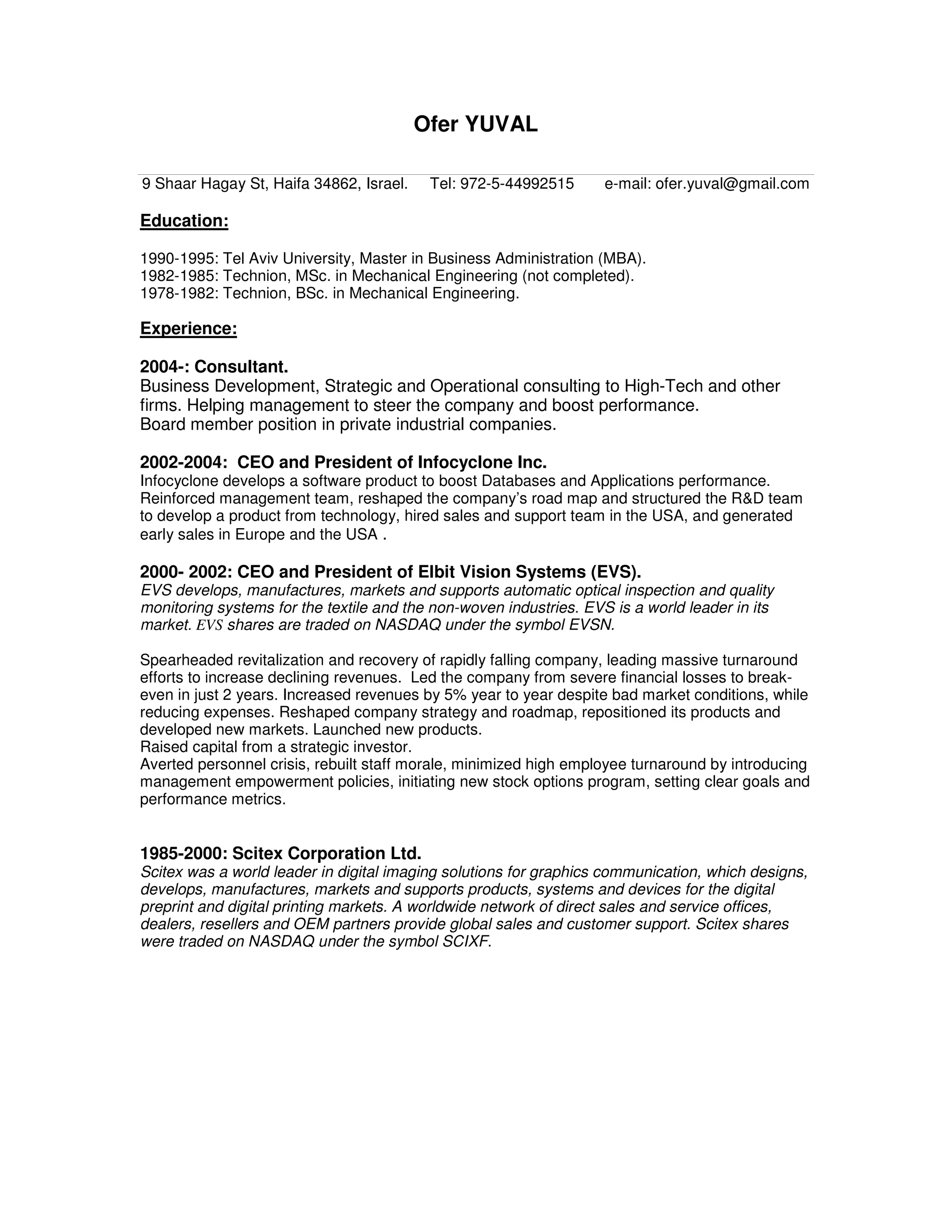 Ofer Yuval has over 30 years of experience in management roles in high-tech companies. He has a Master's in Business Administration and began his career as a mechanical engineer. Notable roles include CEO positions at Infocyclone and Elbit Vision Systems, and Vice President of Operations roles at Scitex Corporation. He has experience turning around companies, developing new products, raising capital, and improving operational efficiency. Currently he works as a business consultant, helping companies improve performance and serving on private company boards.