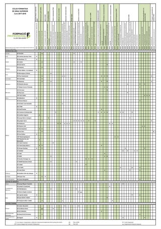 IES Alcúdia l l Artà IES Llorenç Garcías i Font l IES Bendinat (*) l IES Calvià l l l IES Son Ferrer l IES Felanitx l (P) Sant Alfons - Es Lladoner l IES Berenguer d’Anoia l IES Pau Casesnoves l l l l l l l Llucmajor IES Llucmajor l l IES Manacor l l l l l IES Mossèn Alcover l l l (P) Global Centre d'Estudis l l l (CC) Es Liceu l IES Marratxí l CIFP Son Llebre l l l Muro IES Albuhaira l IES Antoni Maura l IES Arxiduc Lluís Salvador l IES CTEIB l IES Emili Darder l IES Francesc de Borja Moll l l l l l l l l IES Guillem Sagrera l IES Josep Maria Llompart l l IES Juníper Serra l l l l l l l l l IES Politècnic l l l l l l l IES Ramon Llull l l IES Ses Estacions l l IES Son Pacs l l(¨) IES Son Rullan l CIFP Nauticopesquera l l (CC) Nuestra Sra. de Montesión l (CC) Sant Francesc l (CC) Sant Josep Obrer I l l l (P) Grupo Fleming l l l l (P) ADEMA l l l l (P) CIDE l (P) EDIB l l l (P) Escola d'imatge i so l l l (P) ESERP Business School l l (P) LADAT l (P) La Salle l l l (P) Lluís Vives l l l Pollença IES Guillem Cifre de Colonya l Sa Pobla CIFP Joan Taix l l Santa Margalida IES Santa Margalida l CENTRES DE MENORCA Alaior IES Josep Miquel i Guàrdia l IES Josep M. Quadrado l (P) ETB-Menorca l l IES Maria Àngels Cardona l l l IES Cap de Llevant l l l IES Joan Ramis i Ramis l IES Pasqual Calbó i Caldés l l l CENTRES D'EIVISSA IES Isidor Macabich l l IES Sa Blanca Dona l l IES Sa Colomina l Sant Antoni de Portmany IES Quartó de Portmany l l Sant Josep de sa Talaia IES Algarb l l l (*) Les classes s'imparteixen a diferents instal·lacions esportives del municipi de Calvià. (A) Títol LOGSE l Cicles implantats CIFP Centre Integrat de Formació Professional (B) Títol LOE Organització temporal especial Ciutadella de Menorca Eivissa Aquesta oferta pot tenir alguna variació depenent del nombre de person es matriculades. Inca Manacor Palma Maó Calvià Felanitx Marratxí Transportimantenimentde vehicles(TMV) CICLES FORMATIUS DE GRAU SUPERIOR Curs 2017-2018 Administracióigestió(ADG) Comerçimàrqueting(COM) Edificacióiobracivil(EOC) Electricitatielectrònica(ELE) Hoteleriaiturisme(HOT) Imatgeiso(IMS) Informàticaicomunicacions(IFC) Instal·lacióimanteniment(IMA) Serveissocioculturalsiala comunitat(SSC) Sanitat(SAN) Maritimopesquera(MAP)