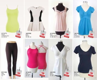 This document is a catalog listing items for sale during a summer sale in 2014. It includes over 100 items of clothing such as blouses, tops, dresses, pants, and skirts in a variety of colors and sizes with corresponding prices listed in dollars. The items appear to be from a women's clothing line and include descriptions of the fabrics, colors, and sizes available for each product.