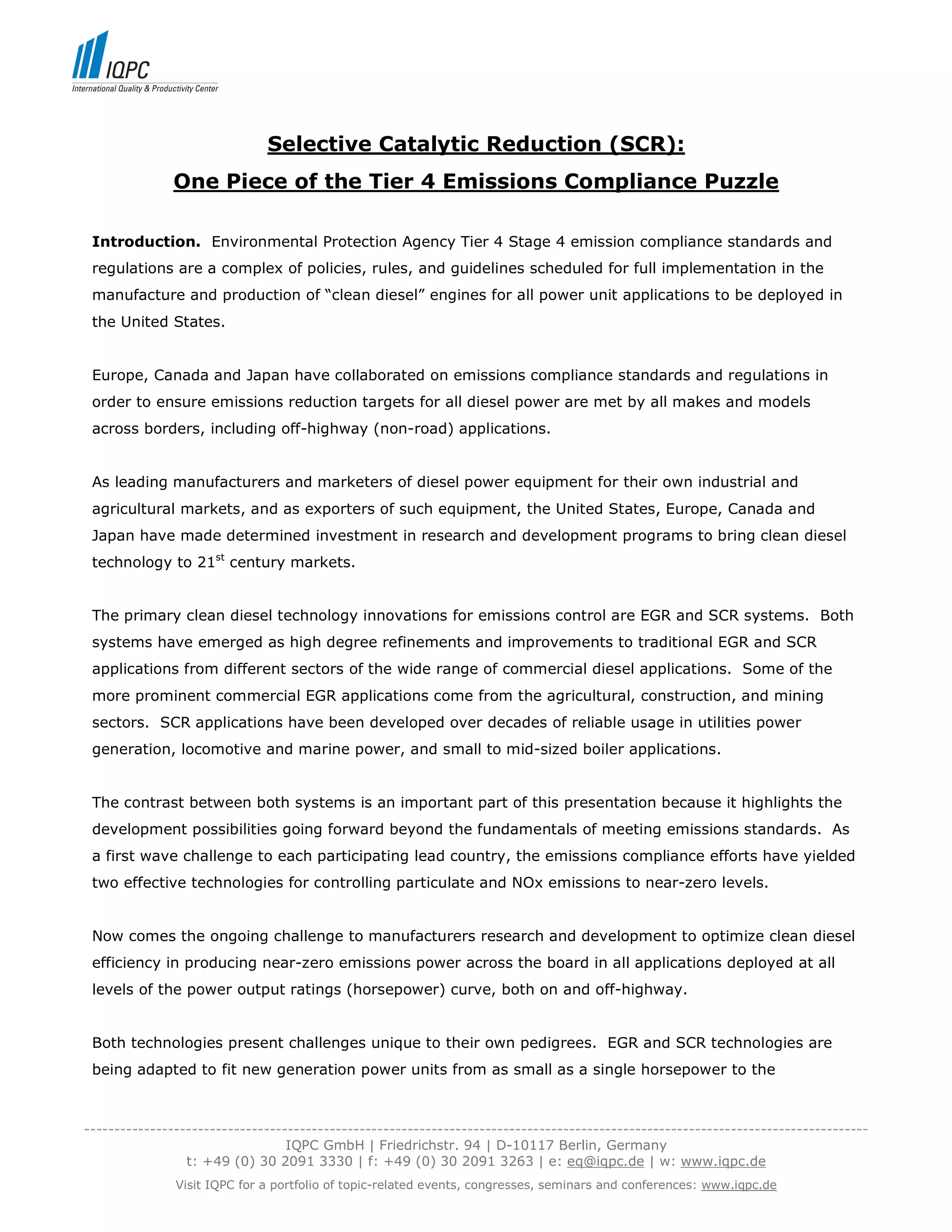Selective Catalytic Reduction (SCR) is an emissions control technology that reduces nitrogen oxide (NOx) in diesel exhaust. It works by injecting urea into the exhaust stream, which reacts with NOx in the presence of a catalyst to produce harmless nitrogen and water vapor. The SCR system includes components like a urea tank, injector, and catalyst that work together to lower NOx levels to near zero. While SCR is effective, it also has limitations related to temperature sensitivity and dependency on urea. Exhaust Gas Recirculation is an alternative technology that some argue is simpler and requires less maintenance.