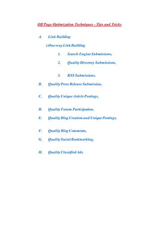This document outlines various off-page optimization techniques to improve search engine rankings, including obtaining one-way links through search engine submissions, quality directory submissions, and RSS feeds. It also recommends creating quality press releases, articles, blogs, forum participation, comments, social bookmarks, and classified ads.