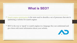 SEO involves optimizing a website to speak to search engines in a way that provides information about the site and aims to improve rankings. On-page SEO refers to on-site elements like titles, URLs, and content that can be optimized. Off-page SEO involves outside activities like link building, social media marketing, and social bookmarking. While link building is the most popular off-page technique, the quality of links matters more than quantity, and natural links from trusted sources are most valuable. Both on-page and off-page optimization are important for a successful SEO strategy.