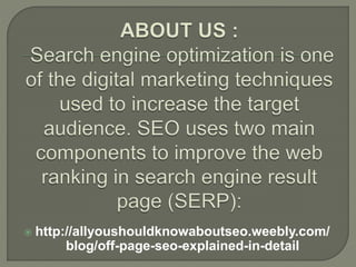 Off-page SEO refers to activities outside of a website that can help improve its search engine rankings. These activities include getting backlinks from other high-quality, relevant sites to pass link authority and gaining social shares on social media platforms. Proper off-page SEO also involves optimizing profiles on directories, citations, and other third-party sites to strengthen online presence and trust signals received by search engines.