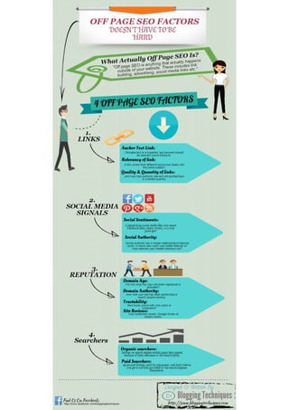 Off Page Seo Factors Doesn’t Have To Be Hard #Infographic Do you know how Google rank your site in search engine? What are those off page seo factors that Google consider to evaluate your site or content? There you can check out this infographic about 4 essential off page SEO factors that plays a vital role to rank a page or site. --> http://www.bloggingtechniques.com/off-page-seo-factors-infographic/