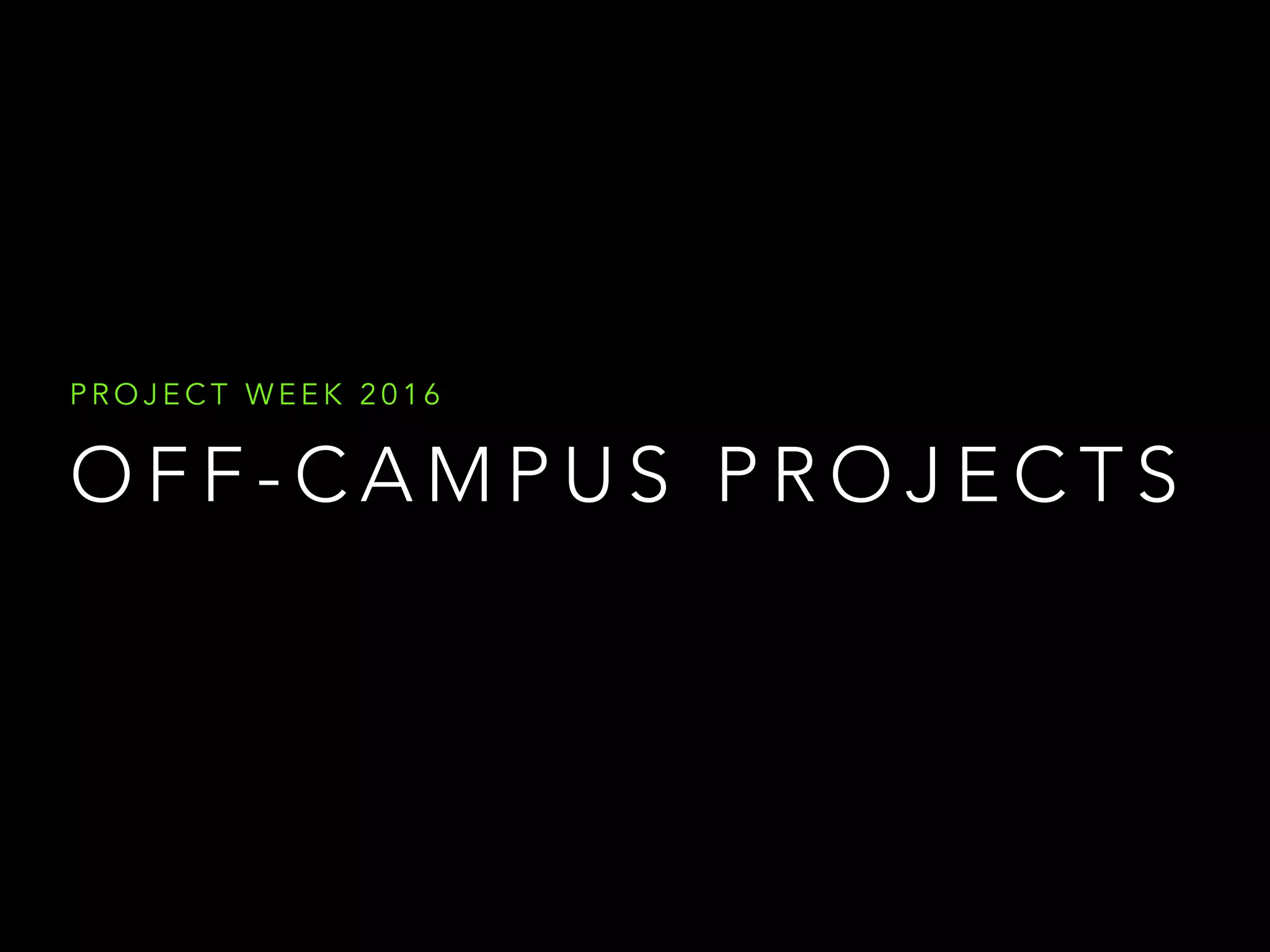 This document lists and describes 8 potential off-campus project options for Project Week 2016, including whitewater rafting in Utah, community building in Costa Rica, studying history and bankruptcy in Greece, observing animals in Ecuador, tourism in Puerto Rico, British culture in London, empowering youth in the Dominican Republic, and provides next steps of checking the blog, conversing with parents and Mr. Joslin, and submitting a deposit.