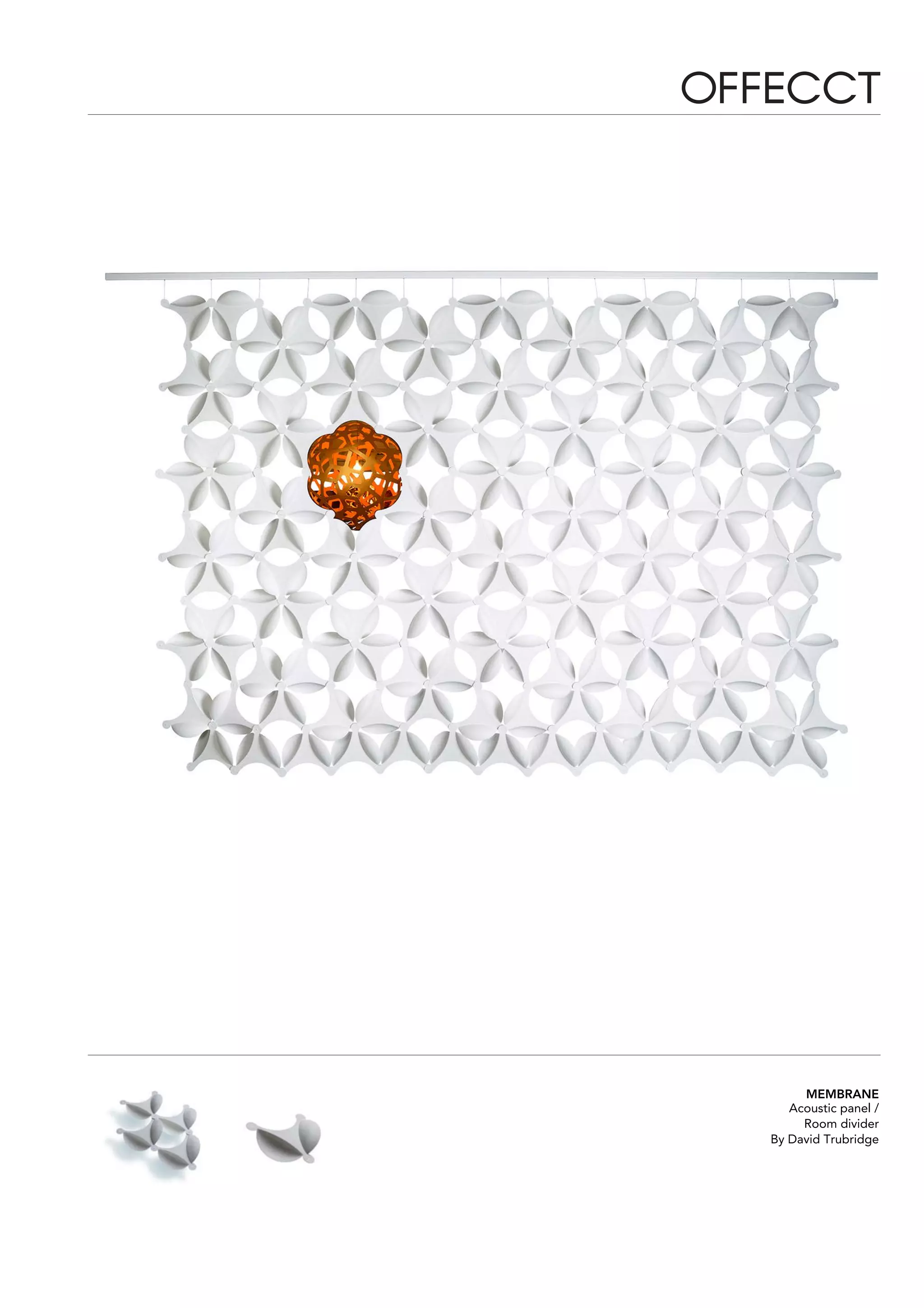Membrane is an acoustic room divider designed by David Trubridge consisting of smaller acoustic panels that create a modular system. The panels filter sound while letting in light, creating a unique expression. The room divider is made from recycled polyester fiber and can be assembled on ceilings or walls to reduce and balance sound in a room. It comes in a kit of 24 acoustic pieces that can be assembled in different patterns.