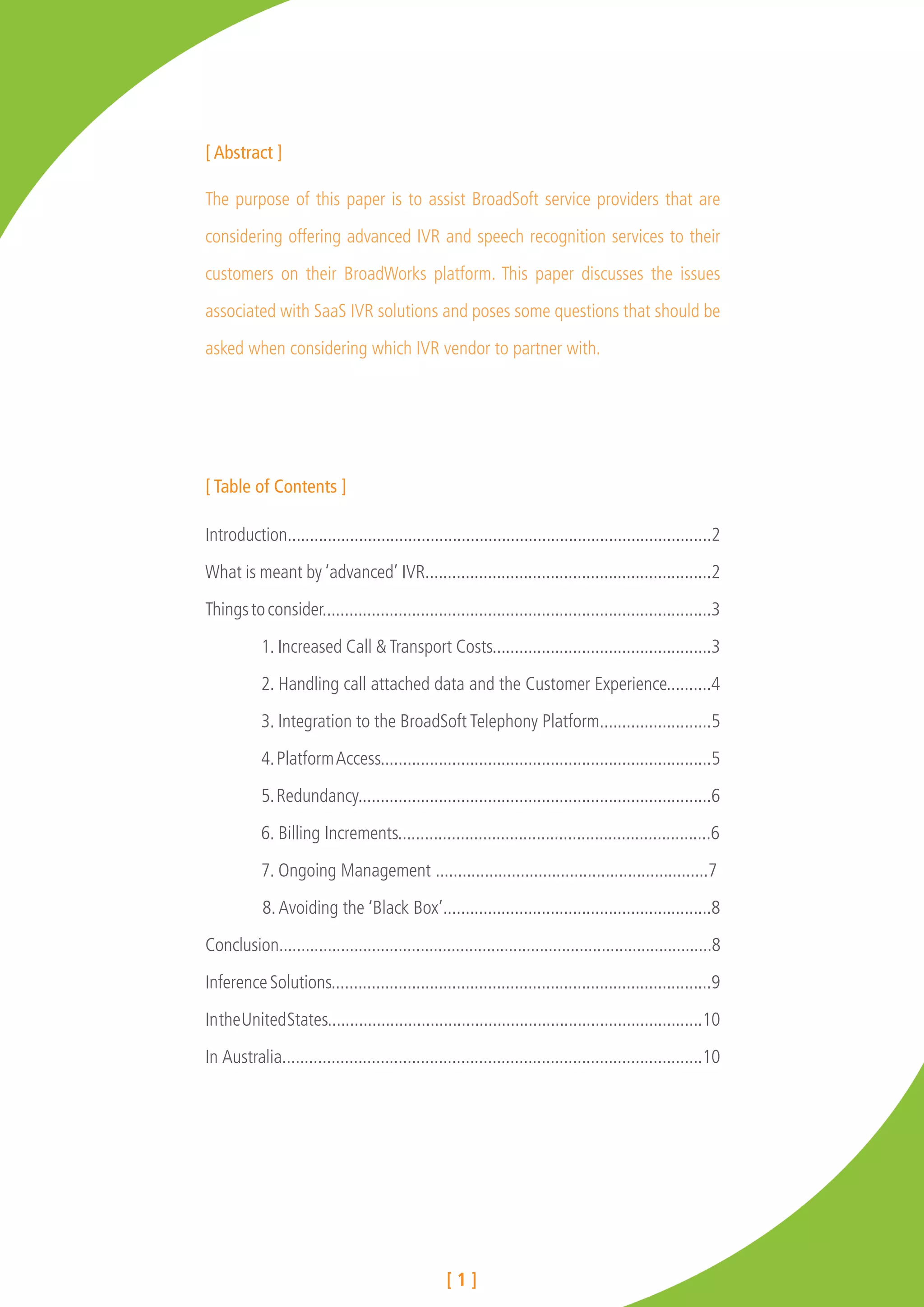 The document discusses considerations for BroadSoft service providers regarding offering advanced interactive voice response (IVR) services through a software-as-a-service model. It outlines key issues like increased call costs, call data handling, integration with BroadSoft, redundancy, billing increments, ongoing management, and transparency. Inference Solutions is presented as an IVR partner that addresses these considerations through their browser-based Studio environment and architecture designed for BroadSoft providers.