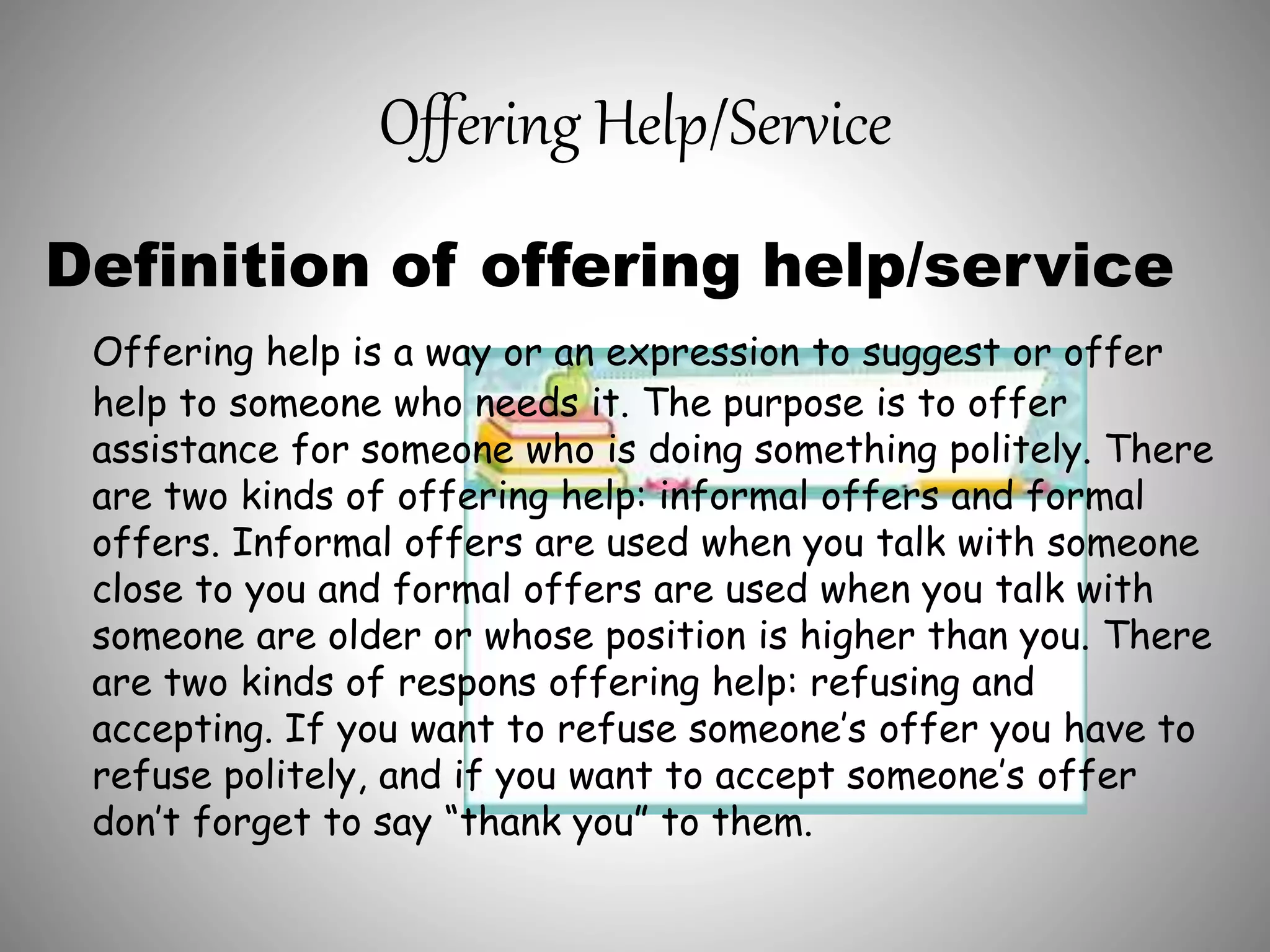The document defines offering help as suggesting assistance to someone who needs it, whether informally to acquaintances or formally to those of higher status. There are two ways to respond to offers of help - accepting politely or refusing politely. It provides examples of language features used in offering help, such as modal verbs and question sentences. It then provides an exercise with examples of offering and accepting help and the suitable responses.