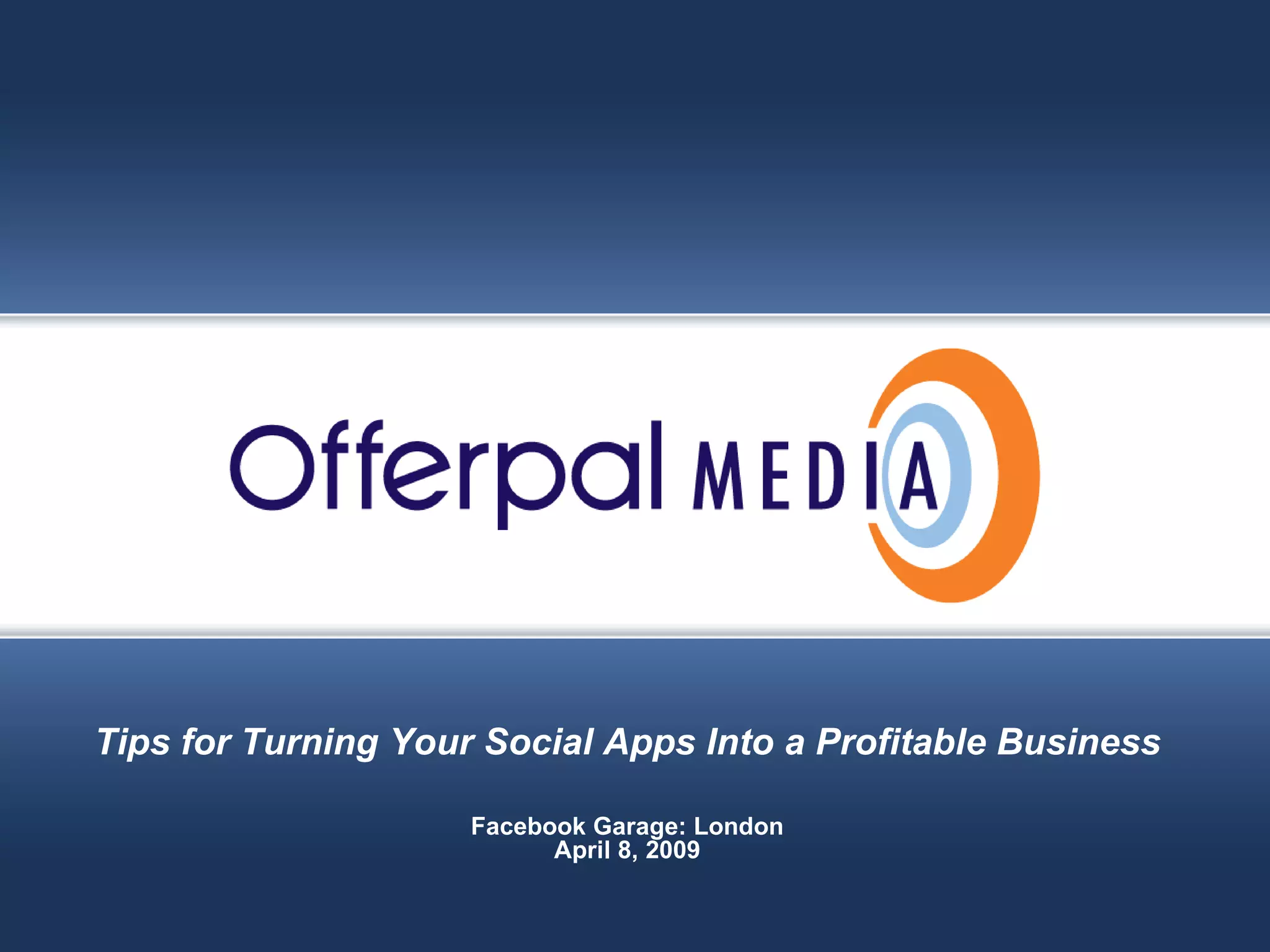 Offerpal Media is a venture capital-funded company that provides monetization solutions for social apps on Facebook and other platforms. They have over 1,000 publisher clients and generate millions of offer completions per month. Their top tips for turning a social app into a profitable business include having a monetization plan beforehand, including virtual currency in the app design, integrating Offerpal's monetization platform, maximizing distribution channels, and regularly updating the app with new features and optimizations.