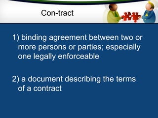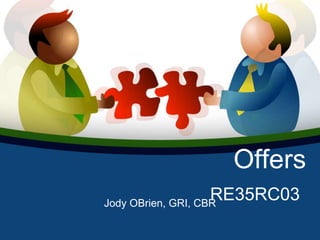 This document discusses offers and contracts in real estate. It defines an offer and contract, and lists the key elements of each. It also outlines different types of offers, how offers must be presented according to law, and how an offer can be accepted or terminated. Key terms discussed include contingent offers, verbal offers, counteroffers, and specific performance for enforcing a contract.