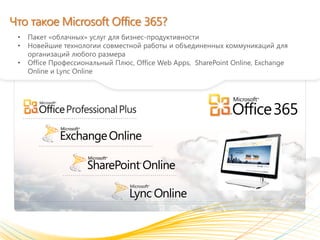 Документ описывает преимущества и возможности Microsoft Office 365, включая облачные вычисления, совместную работу и безопасность. Он предназначен для различных клиентских сегментов, таких как малый и средний бизнес, образовательные учреждения и корпоративный сектор. В документе также упоминается поддержка и соблюдение стандартов безопасности обработки данных.