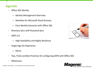 This document provides an overview and agenda for a presentation on single sign-on with Active Directory Federation in Office 365 and SharePoint Online. The presentation covers Office 365 identity management, different identity scenarios including directory sync and ADFS, preparing the Active Directory environment, deploying and configuring ADFS, and best practices. It includes diagrams of common identity architectures and an ADFS farm architecture comparison. The goal is to explain how to implement single sign-on for Office 365 using ADFS federation.