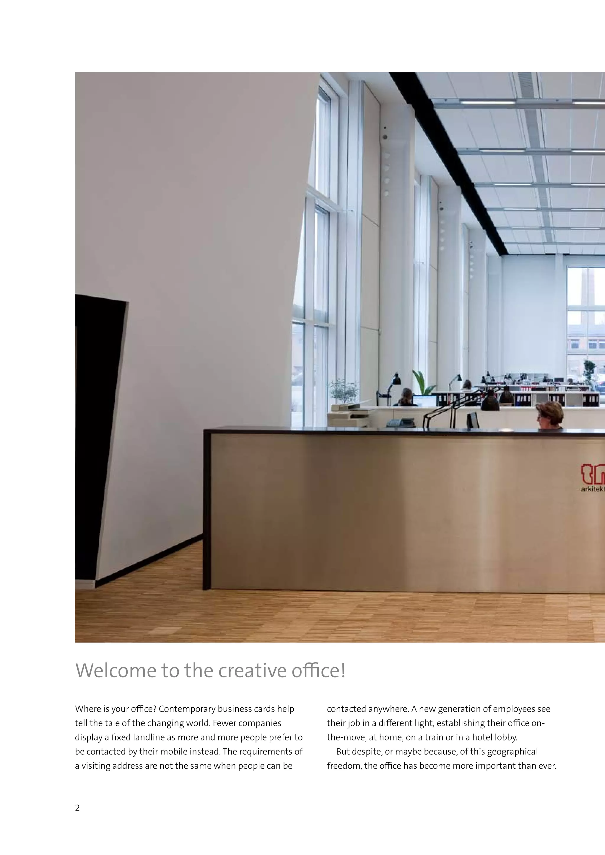 The document discusses the evolving concept of the office environment, emphasizing the importance of creative design, particularly in lighting, to enhance employee wellbeing and productivity. It highlights that modern workplaces prioritize flexibility, activity-based working, and the need for face-to-face interactions, while also showcasing how effective lighting can significantly impact creativity and performance. The text advocates for a holistic design approach that utilizes LED technology for its benefits in energy efficiency and mood enhancement, transforming the office into an inspirational space that aligns with brand identity.
