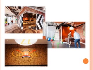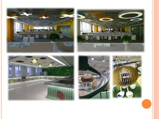 The document provides a comprehensive overview of office design covering its definition, historical context, and various office types including cellular, combination, team, and open space offices. It discusses trends in office spaces such as the use of color, lighting, and eco-friendly designs aimed at enhancing employee well-being and productivity. Additionally, it highlights examples of contemporary office designs that integrate playfulness, natural elements, and community-oriented spaces.