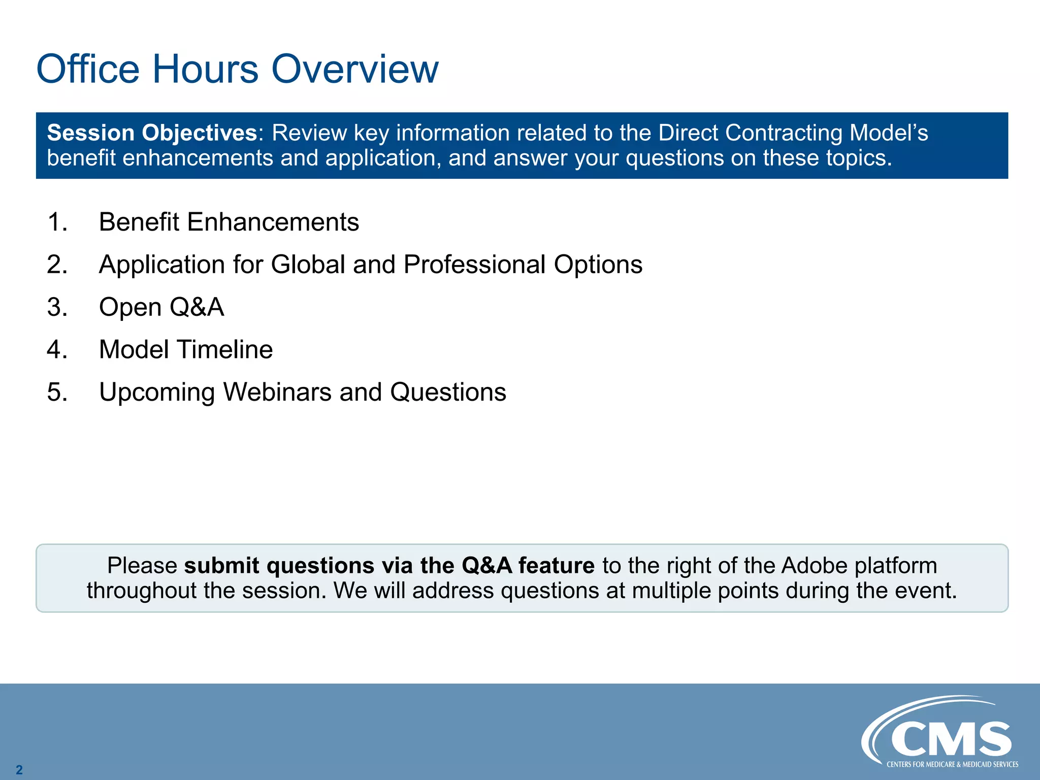 The document outlines the objectives and framework of the Direct Contracting Model, detailing benefit enhancements and application processes for global and professional options. It highlights several proposed patient engagement incentives and waivers available to Direct Contracting Entities (DCEs), aimed at enhancing care management and patient services. Additionally, it provides a timeline for application periods, upcoming webinars, and contact information for further inquiries.