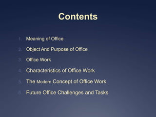 The document discusses the meaning, purpose, characteristics and future of office work. It defines an office as a place where business activities are planned and information is received, handled and stored. The main purposes of an office are to facilitate decision making, coordination between departments, and preserve business records. Office work involves tasks like handling communication, accounting, and planning. Modern offices aim to standardize processes, simplify work, and establish control mechanisms to ensure efficiency. Future challenges for offices include reducing paper work and costs while meeting government regulations.
