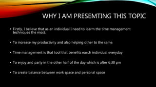 The document emphasizes the importance of time management in enhancing personal productivity and career success by effectively planning, setting goals, and prioritizing tasks. It provides practical tips for time-saving strategies such as preparing in advance, organizing workspace, and batching similar tasks to minimize distractions. Additionally, it highlights the value of setting deadlines and maintaining a balanced work-life approach to reduce stress and increase efficiency.