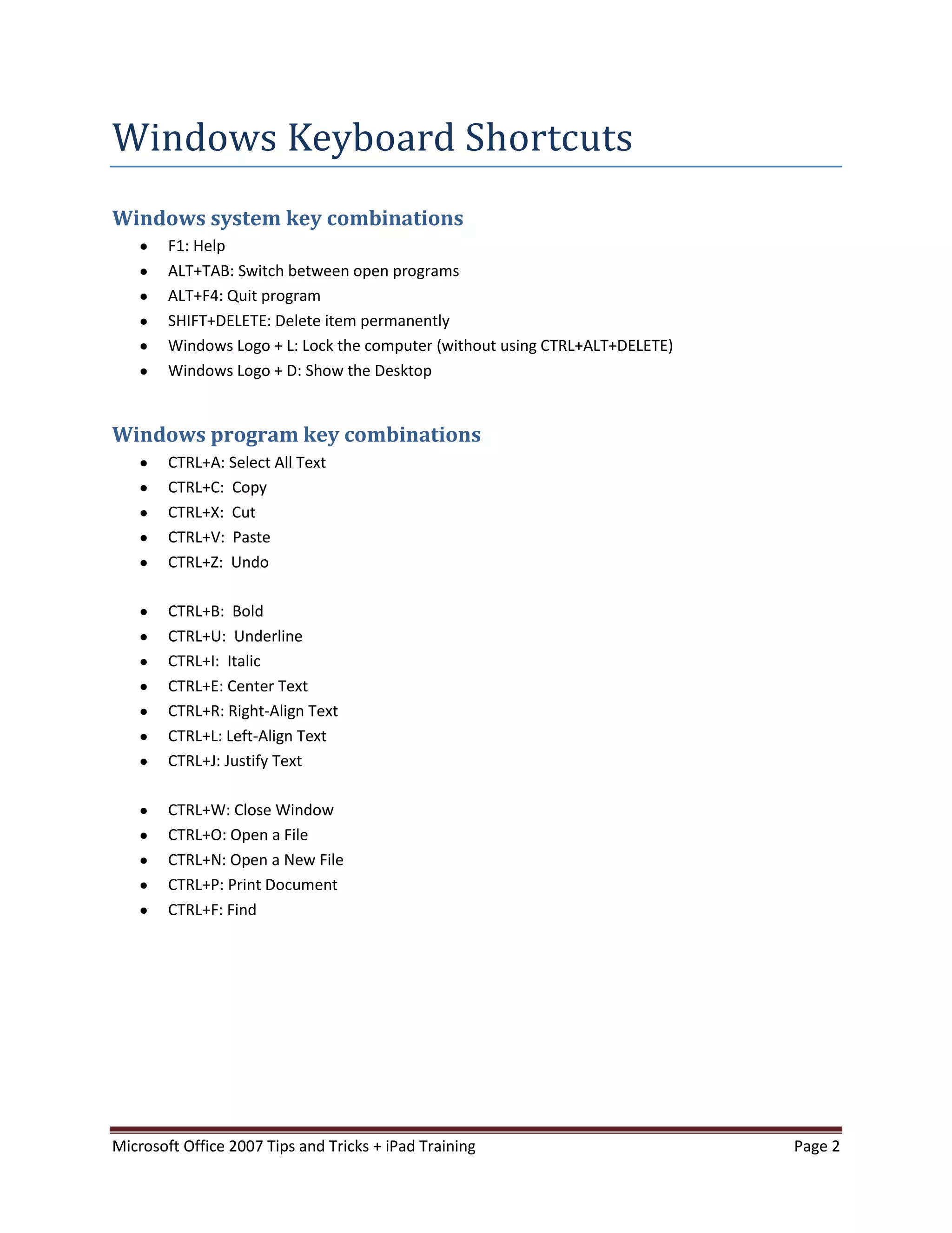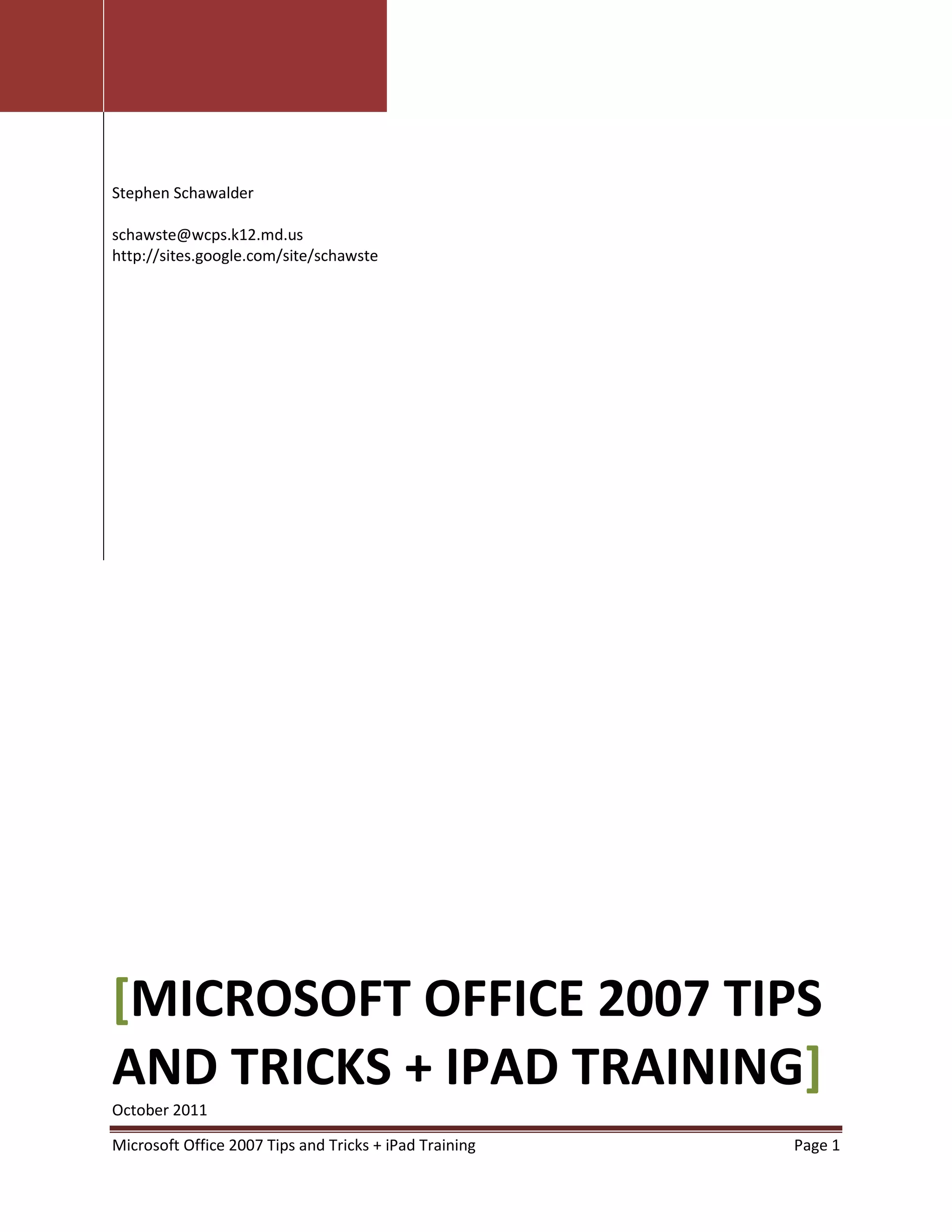 This document provides tips and tricks for using Microsoft Office 2007 and an iPad in the classroom. It discusses keyboard shortcuts in Windows and Office programs. It offers ways to use autocorrect, set default fonts, remove formatting, and create quick parts in Word. In PowerPoint, it suggests using autocorrect for accents and tracking changes to provide digital feedback on student work. It also provides ideas for integrating Office programs and useful apps to use on the iPad for language learning.
