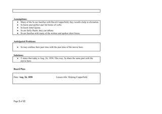 This document outlines a 60-minute English lesson plan aimed at helping students use the third conditional to talk about an imaginary past and write sentences describing the fictional past of the main character in David Copperfield. The lesson includes a warmer discussing the character's problems, a presentation on third conditional grammar forms, a controlled practice activity completing sentences in the grammar forms, a listening activity to identify short grammar forms, and production activities where students write letters to the character and participate in a debate about positive versus negative thinking.