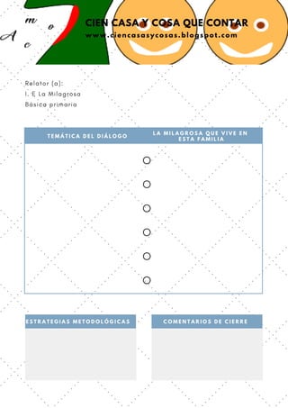 This document appears to be a template for recording dialogues from family visits as part of a project called "100 Homes and Things to Tell". It includes sections for recording the date of the visit, hosts, student leader, highlights from discussions, the family's main discussion topics, and methodological strategies and closing comments. The overall purpose seems to be to document conversations with families to learn about their lives, experiences, and beliefs.