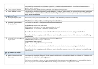 The document outlines a weekly lesson plan for Grade 7 Science focusing on the levels of biological organization. It includes curriculum content, performance standards, learning objectives, and teaching procedures to engage students in understanding how different levels of organization function within living organisms. The lesson incorporates activities, discussions, and assessments to ensure students grasp the concepts and their relevance to the broader context of sustainable development.