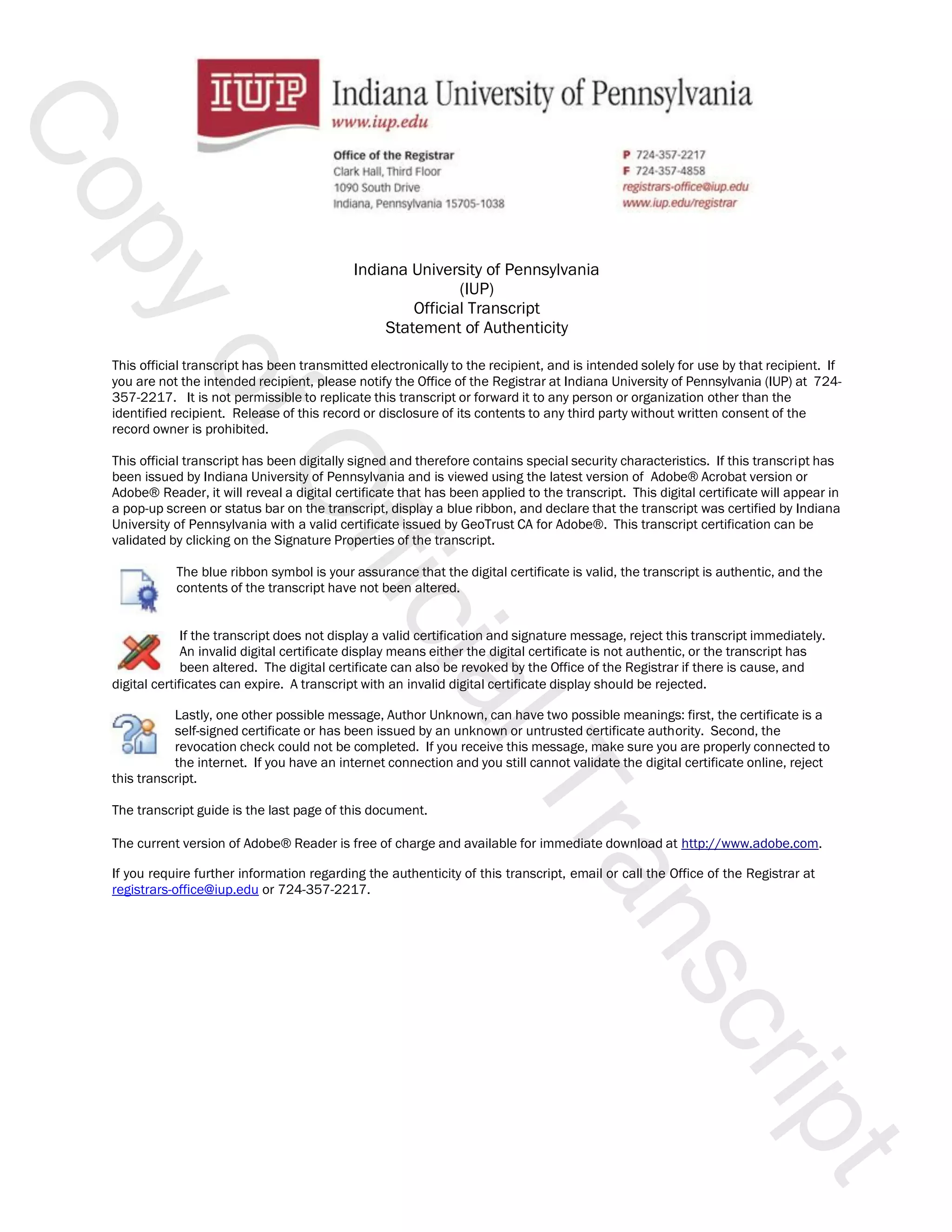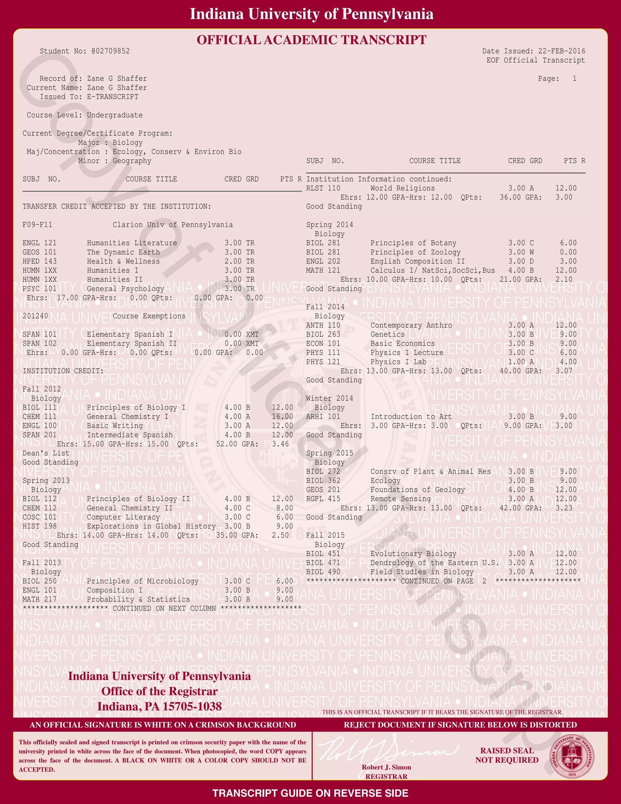 This official transcript from Indiana University of Pennsylvania documents the academic record of Zane G Shaffer. It shows that Shaffer earned a total of 115 credits with an overall GPA of 3.04, including 98 credits and a 3.04 GPA from IUP. The transcript details Shaffer's coursework, grades, credit transfers from other institutions, academic honors including Dean's List, and current in-progress spring 2016 courses. It contains security features to validate the transcript's authenticity.