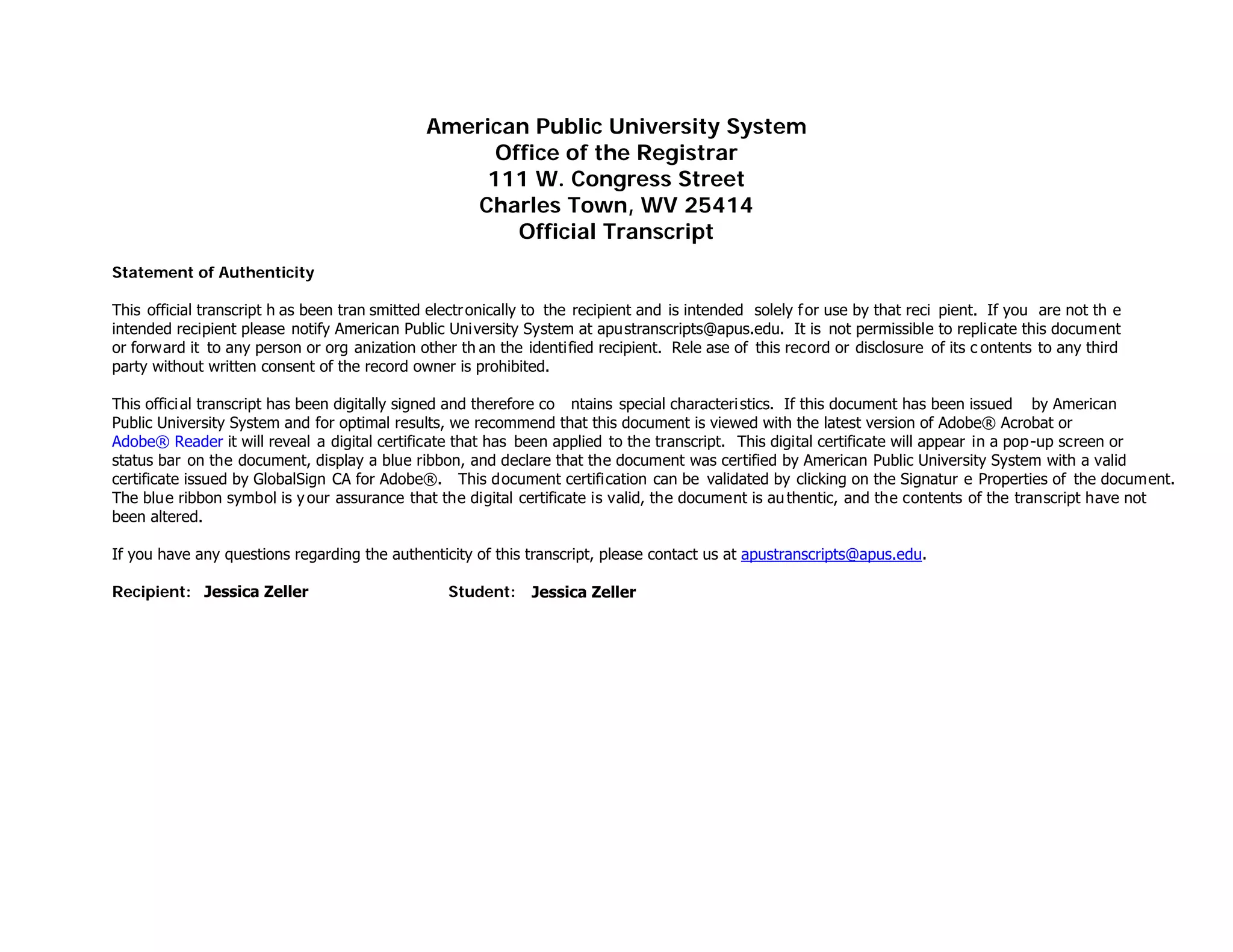 This official transcript belongs to Jessica Zeller and was issued by American Public University System. It details her educational history, including transfer credits applied from other institutions and courses completed at American Military University. Jessica earned a Bachelor of Business Administration degree in Information Technology Management from American Military University on December 3, 2013 with a cumulative GPA of 3.2054. The transcript is certified as authentic by a digital signature and contains information about the university's grading system, academic calendar, and degree requirements.
